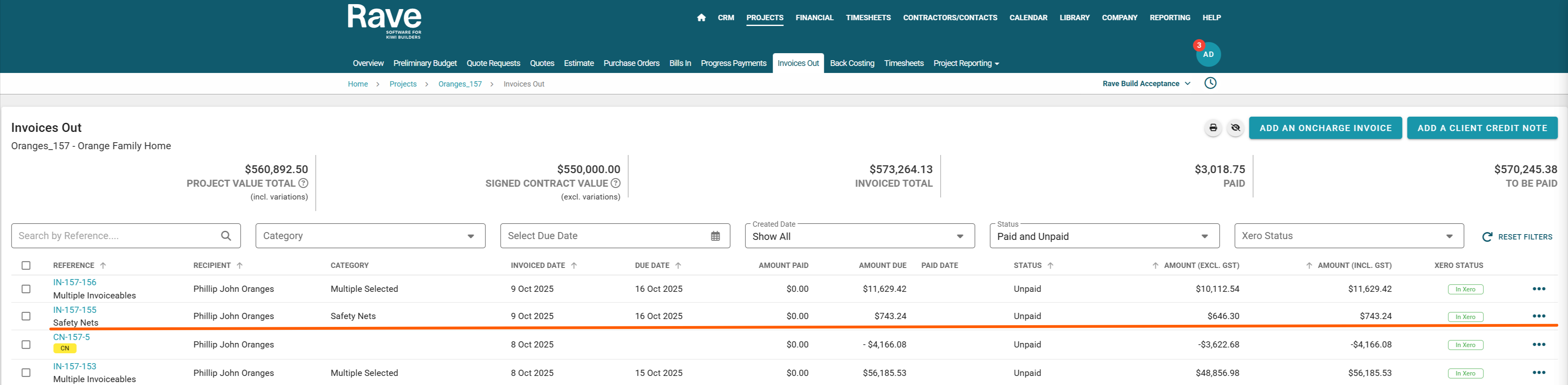 Moving over to the 'Invoices Out' sub-tab, you'll see that there have been multiple categories selected for this invoice. Clicking on the Invoice Number (from the reference column) to open the invoice.