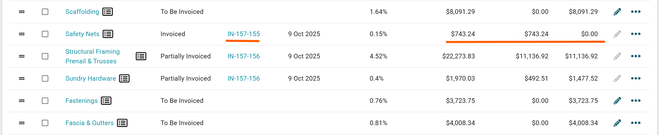 The Progress Payment page will update, displaying the invoice number in the Invoices column, with the Date Invoiced and Invoiced to Date columns populated - the Balance column will also be updated with the remaining balance to be invoiced.
