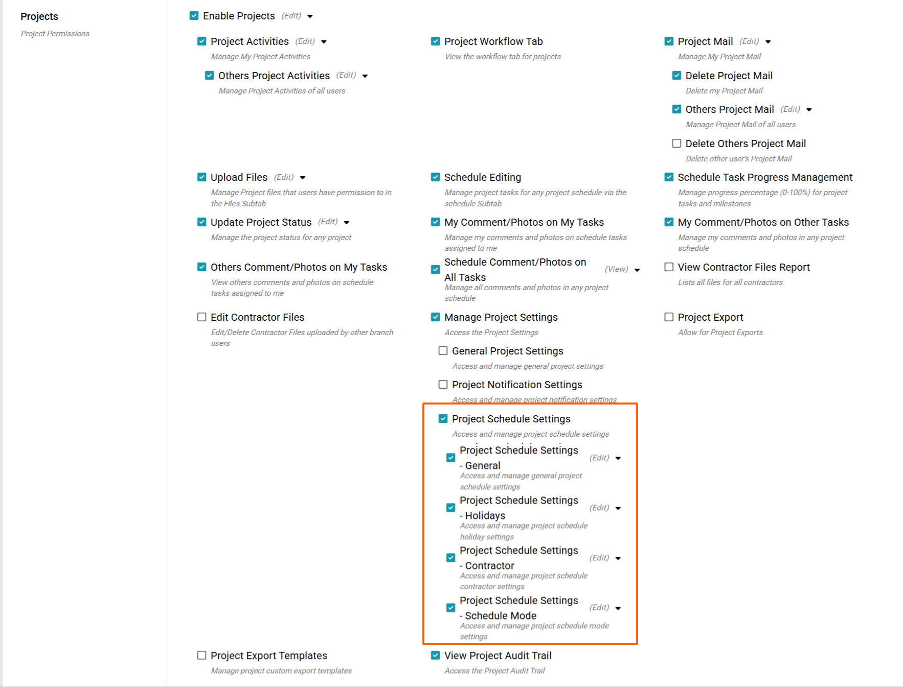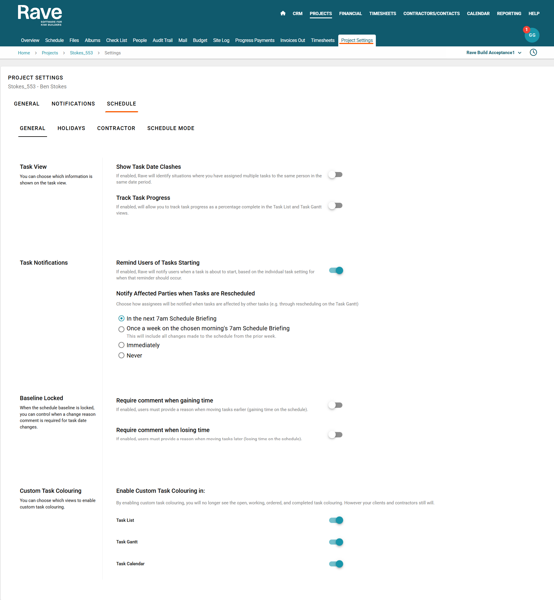 You can access your Project Schedule Settings (with the appropriate permissions) from within your project by clicking the Project Settings sub-tab and then navigating to the Schedule tab.