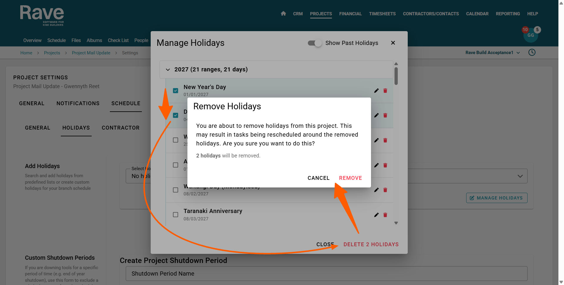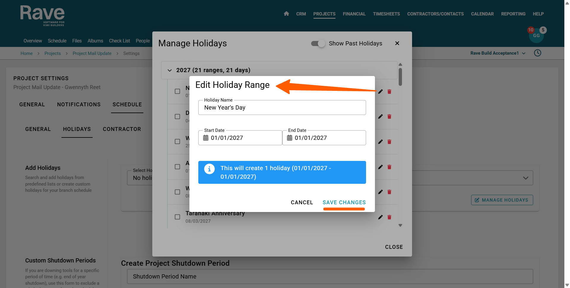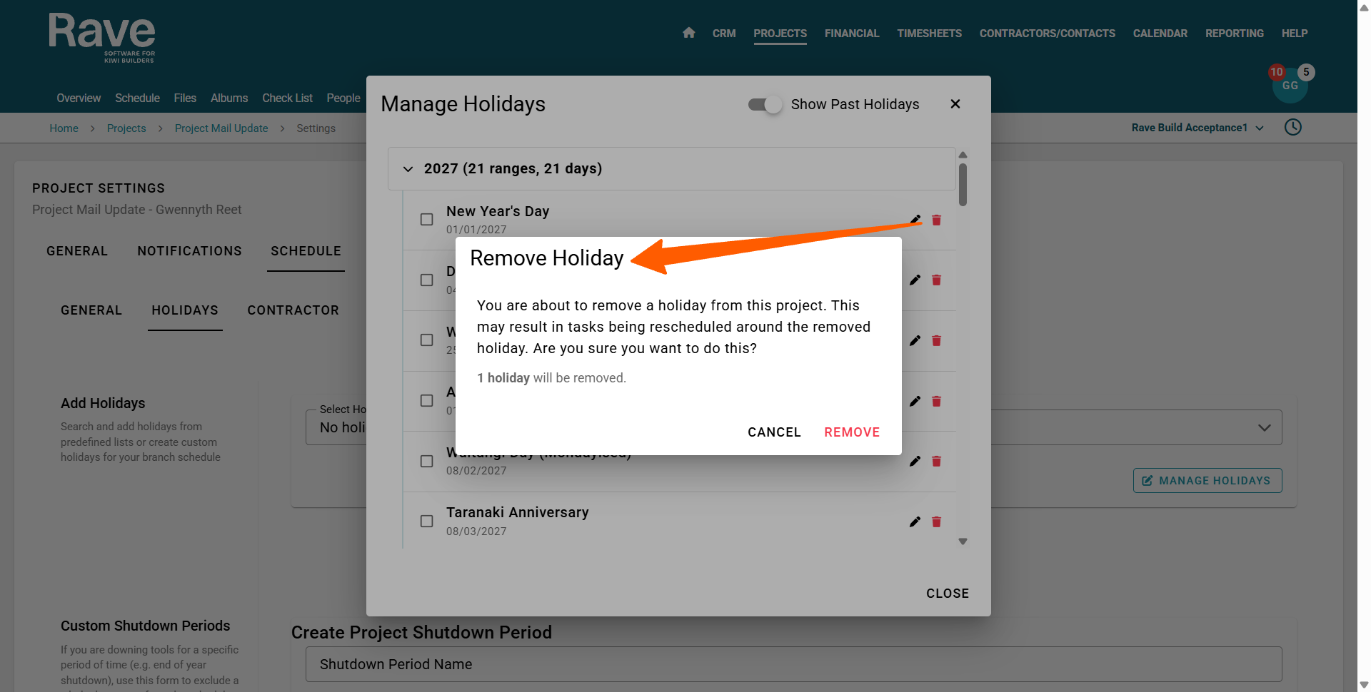 You can edit or delete any holidays, and project shutdown periods, by scrolling to the top of the holidays screen and selecting Manage Holidays. This will pop up the modal to select the holiday(s) you wish to edit or delete.