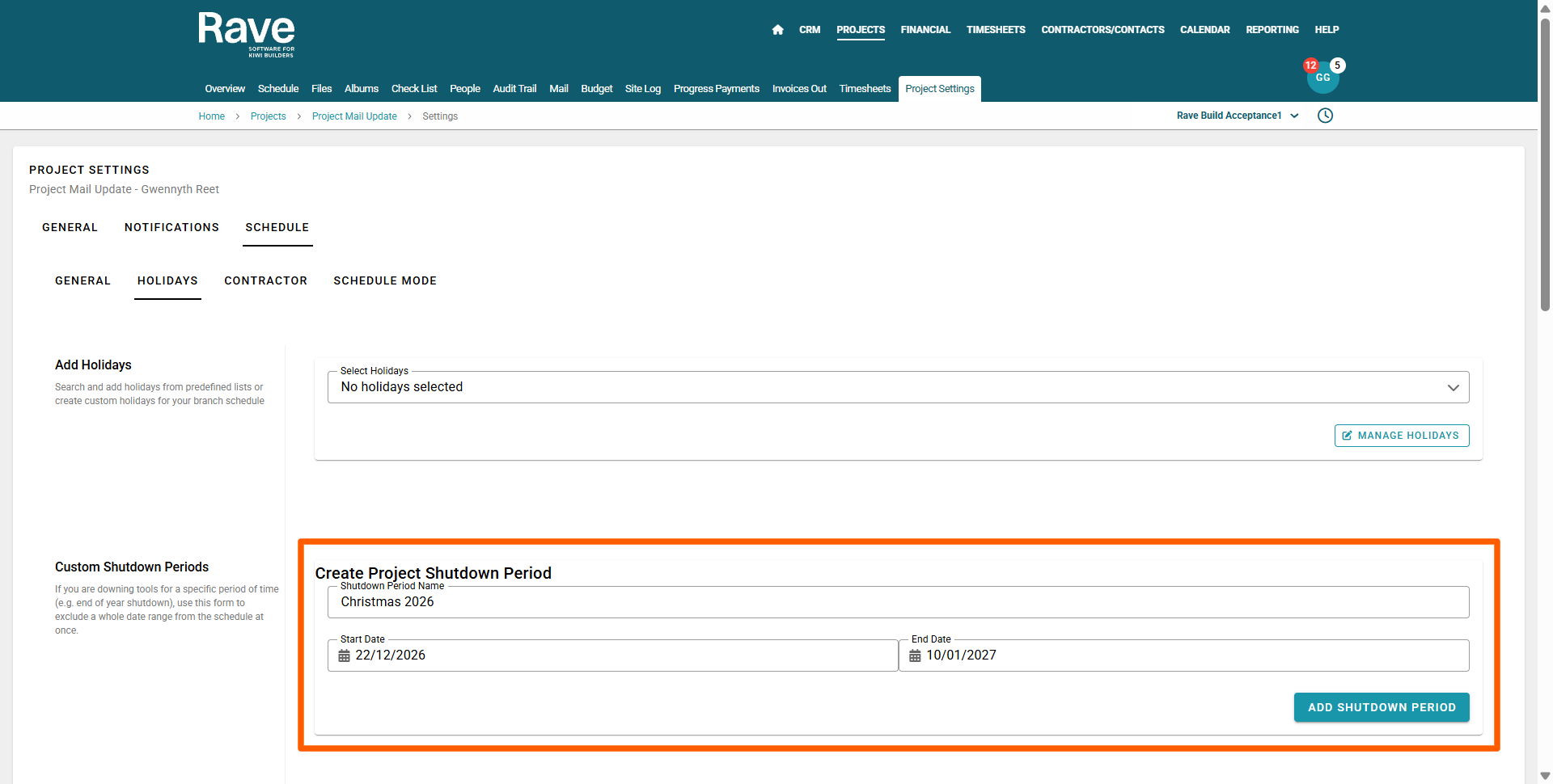Navigate to the Create Project Shutdown period box and Type in a name for the shut down.