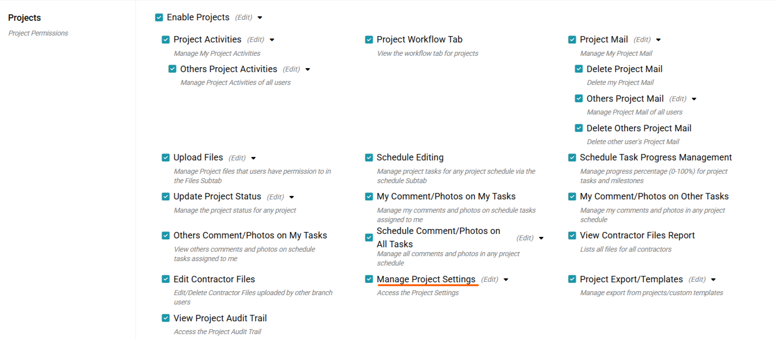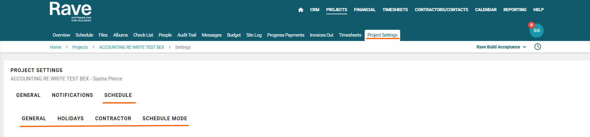 You can access your Project Schedule Settings (with the appropriate permissions) from within your project by clicking the Project Settings sub-tab and then navigating to the Schedule tab. There you will find four sub-tabs that allow you to manage your per-project schedule settings.