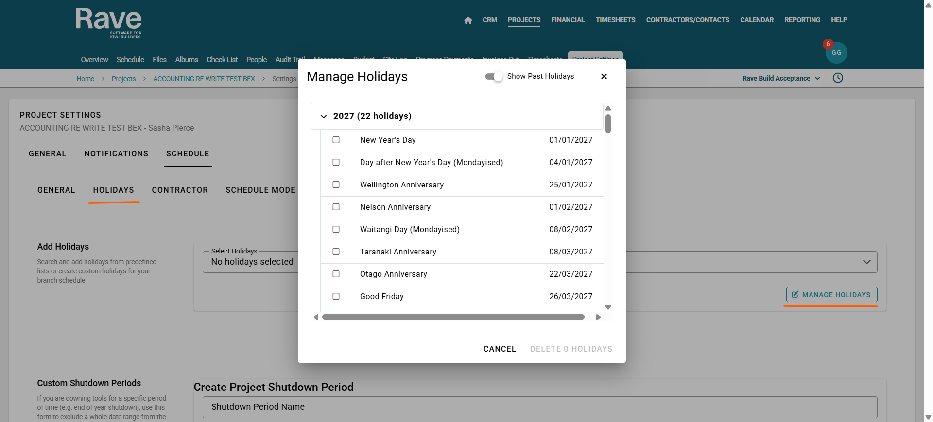 You can edit any holidays at any point by scrolling to the top and selecting Manage Holidays. This will pop up the model to select the holiday (s) you wish to delete. You can also access Past Holidays by sliding on the slider to the top right of the model.