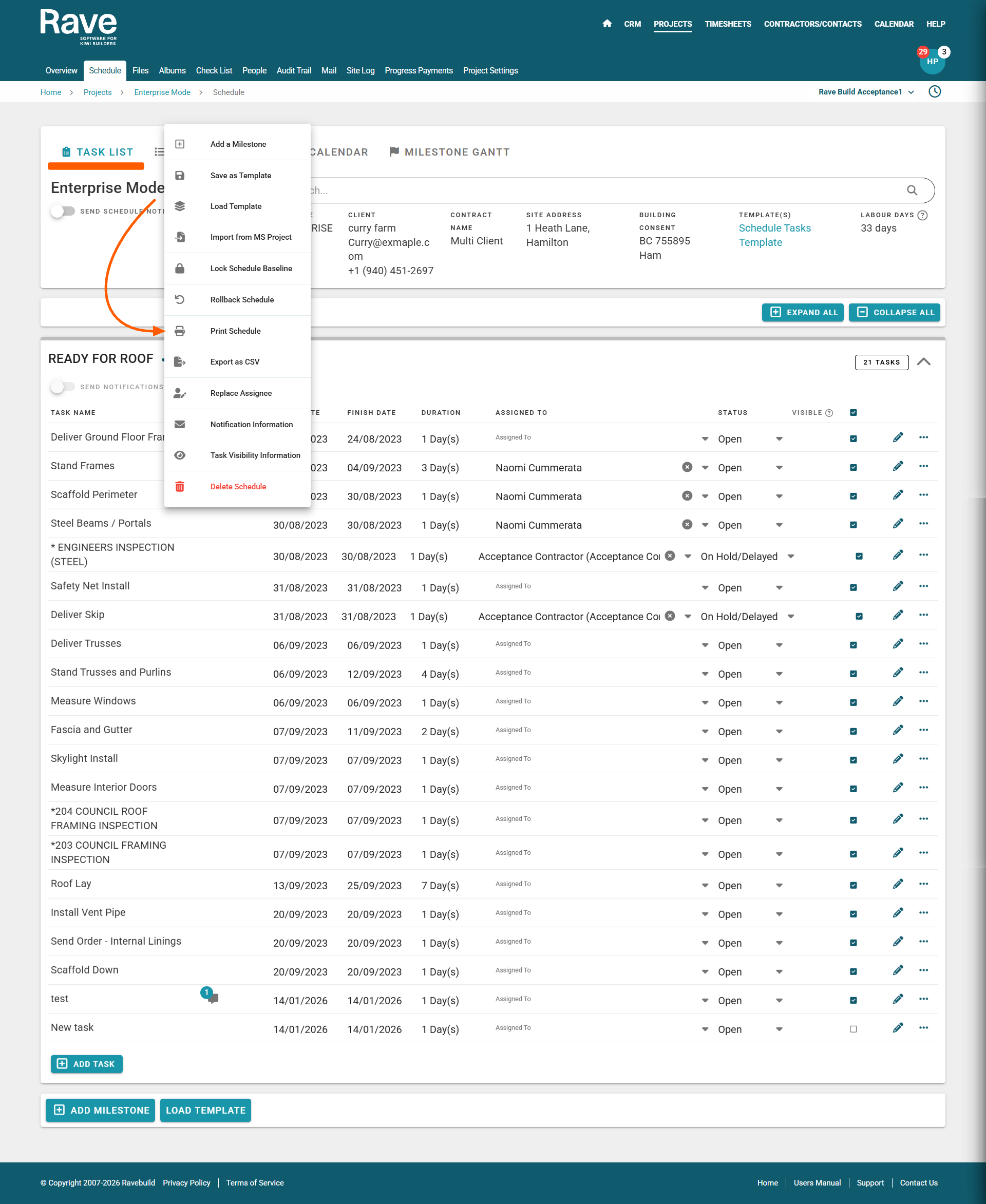 From The projects Tab select the project you wish to access. Click on the blue project id hyperlink then select schedule. From here you can access printing your schedule Task or Gannt View