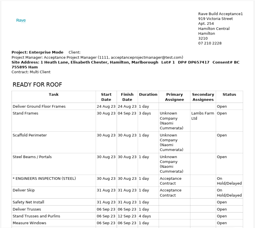 Screenshot below showing Gantt Chart Image with contractors company name and first and last name