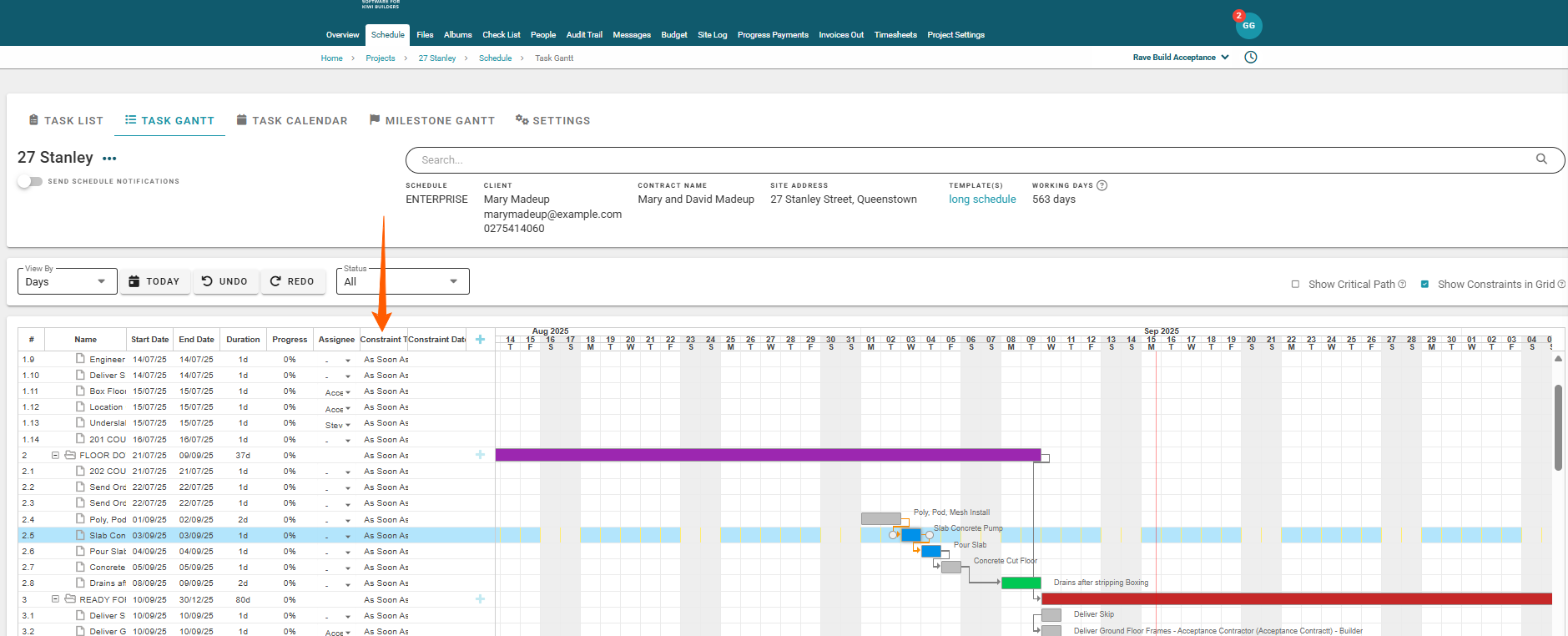 NOTE: Make note of the direction of the arrow showing that the link is going from the end of 'Task A’ (Inslab plumbing & electrical) to the end of 'Task B’ (Floor prep & Inspection)