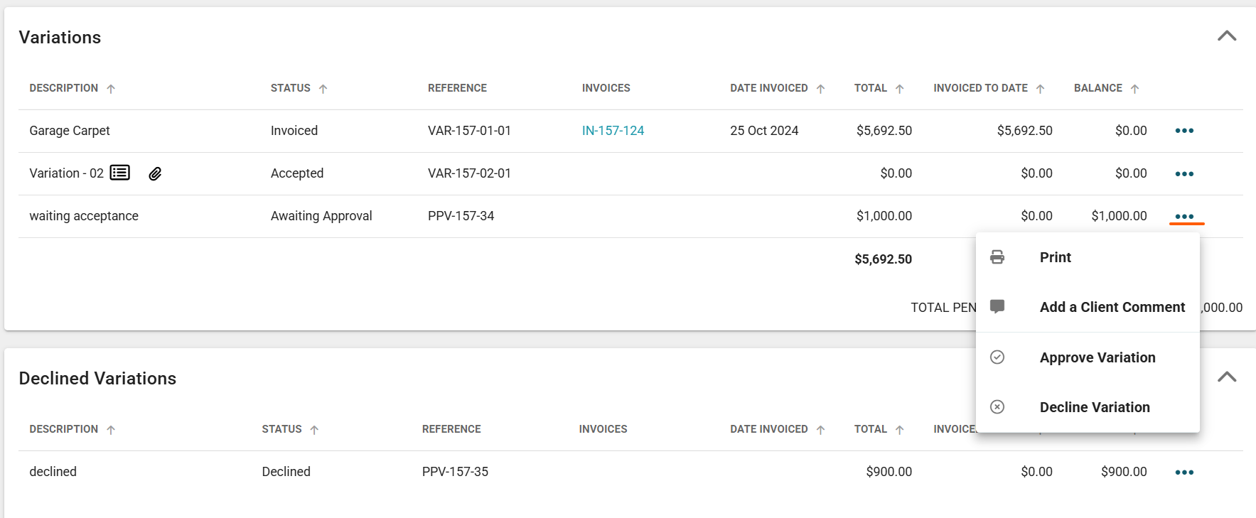 Once a Variation is declined, you can only print the variation or add a comment for your Builder.
