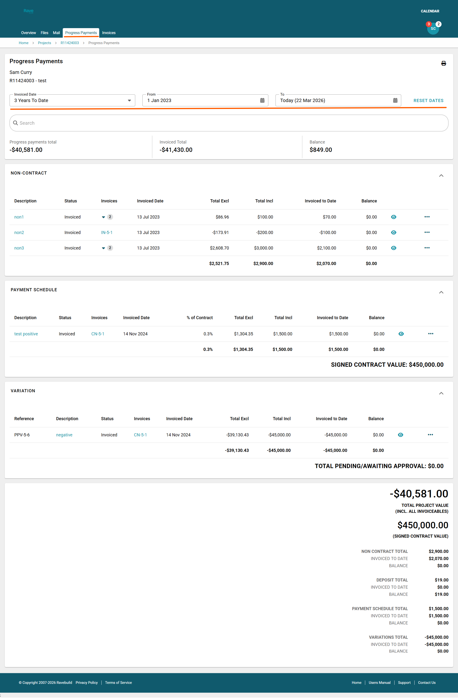 - A breakdown of each payment section with their Total, Invoiced to date and balance to invoice.