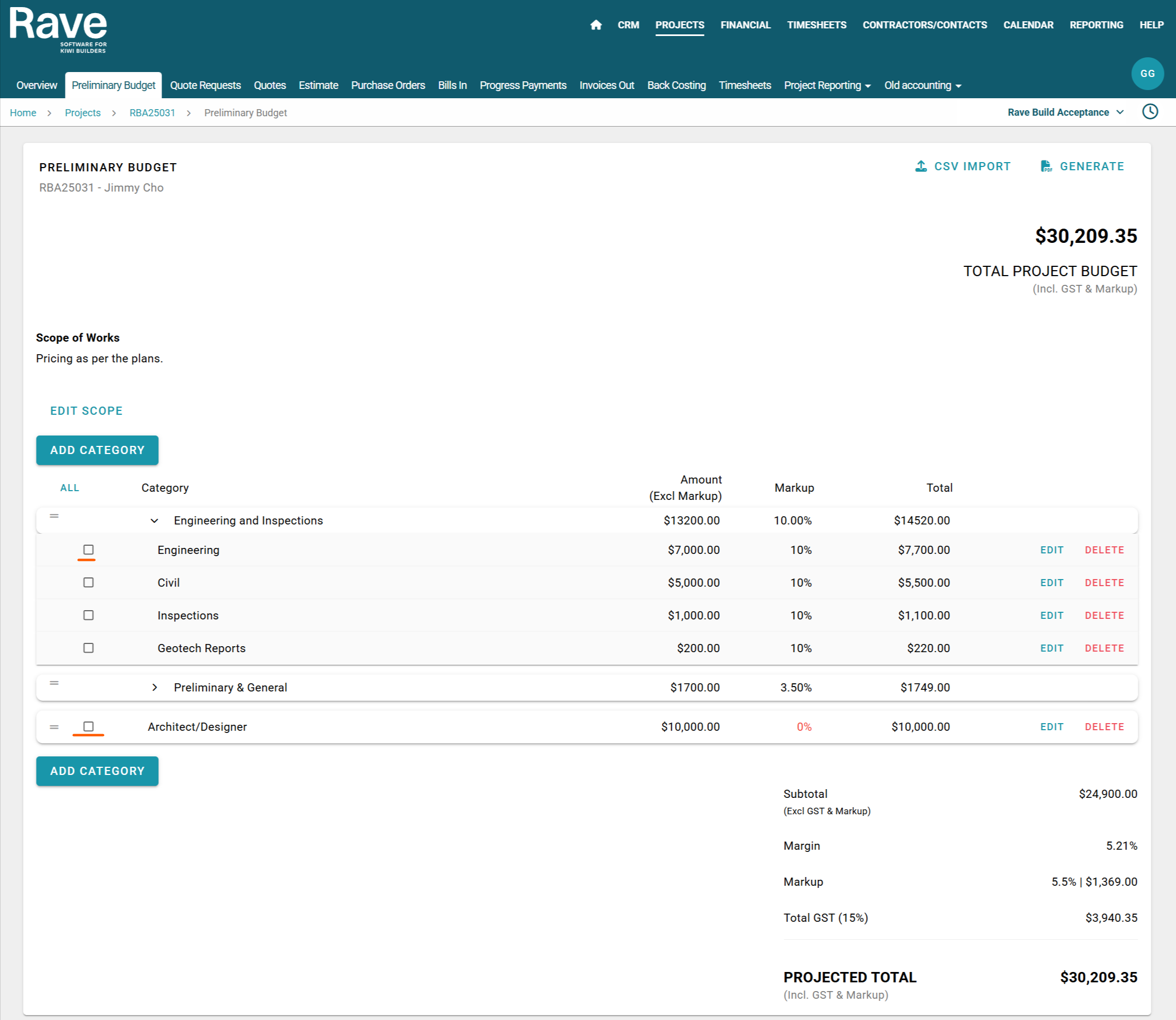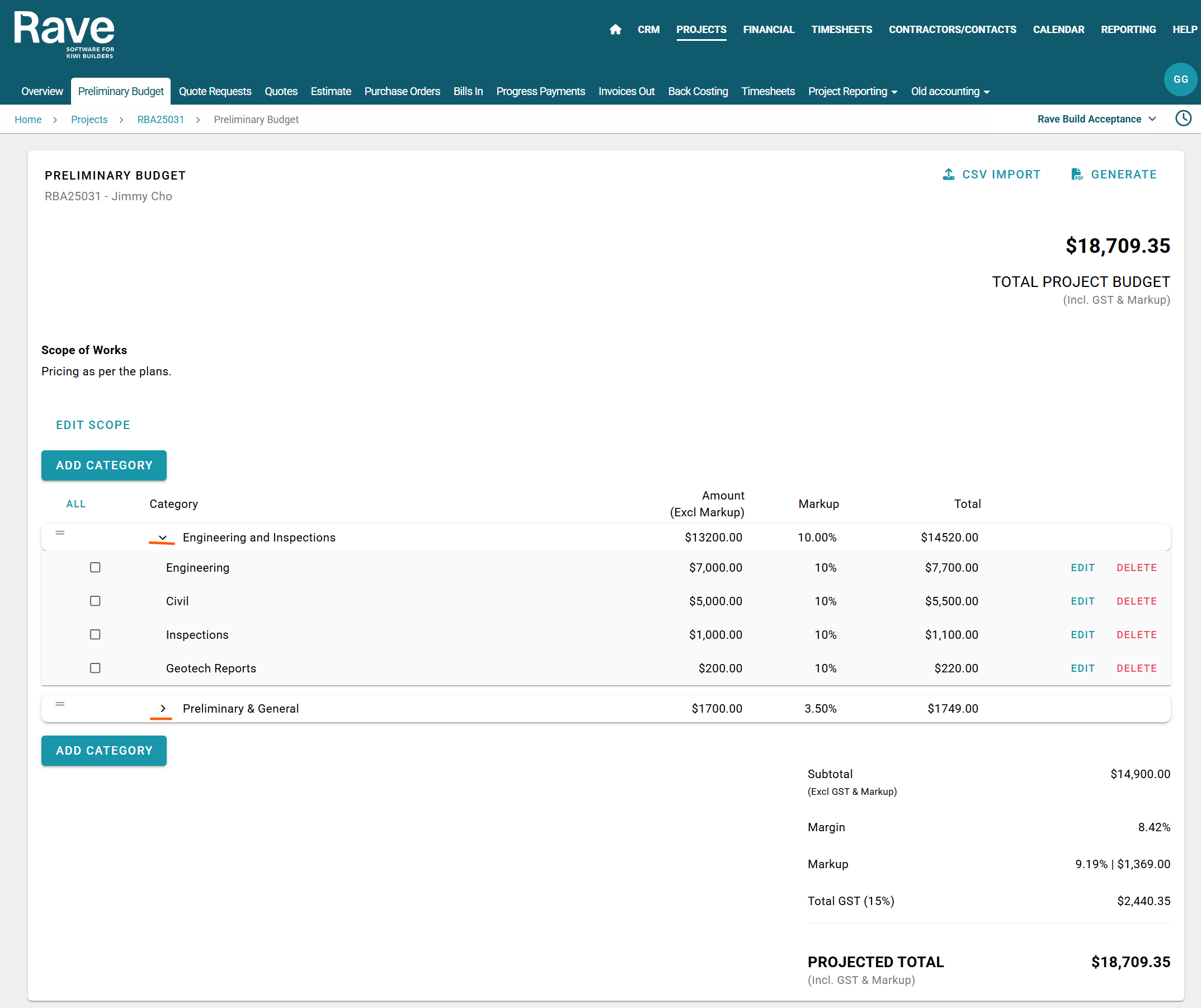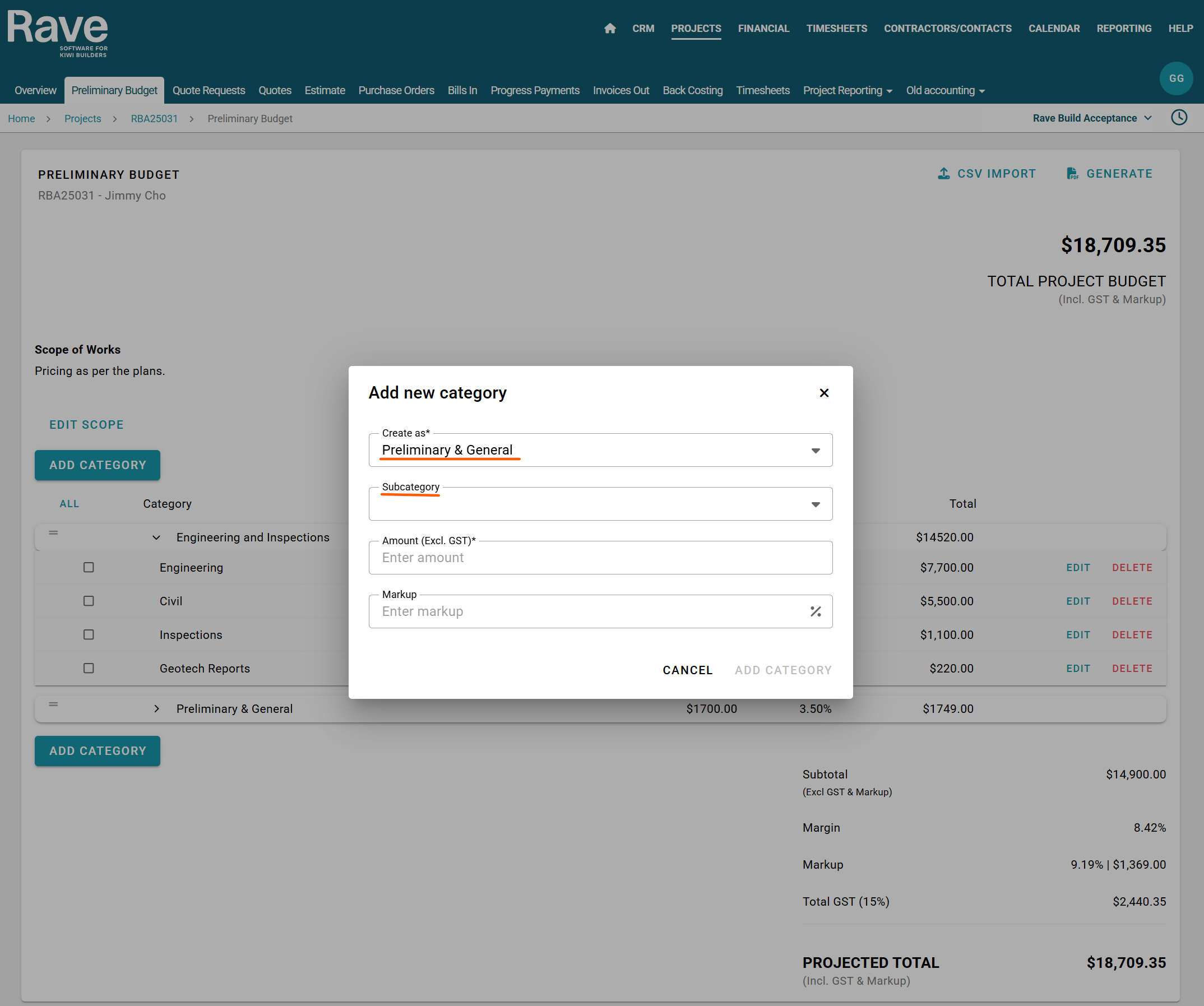 The Preliminary Budget sub-tab is used to create a quick project budget or a client preliminary budget proposal. Within this section, you can easily include a scope of work description and apply a margin or markup to both category and sub category levels.