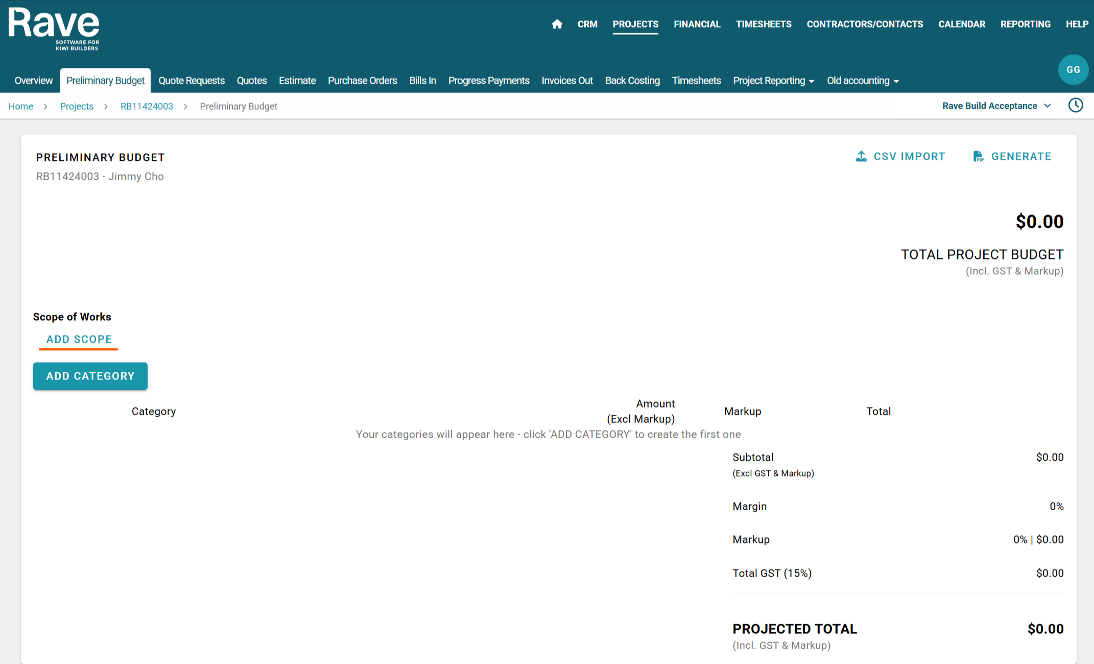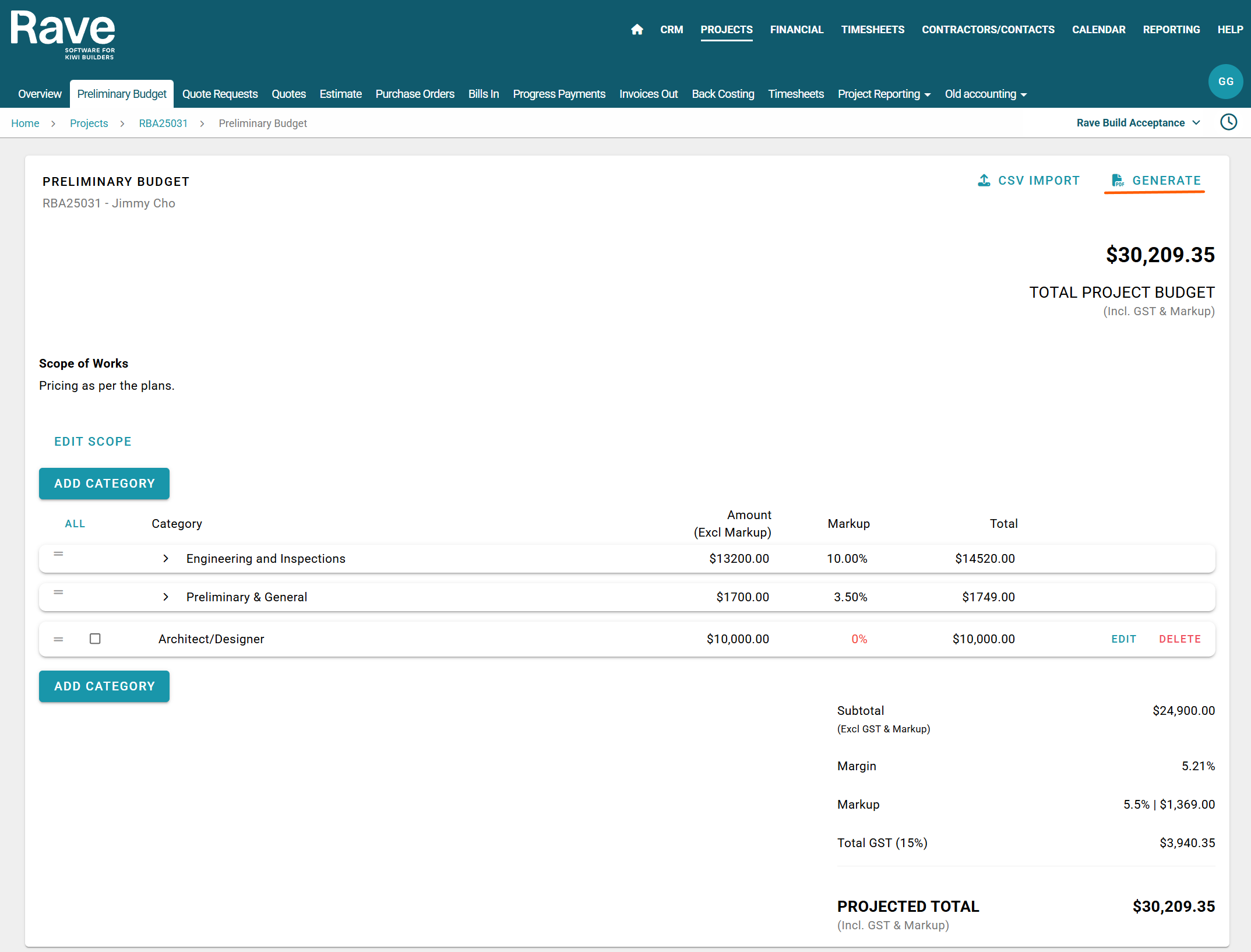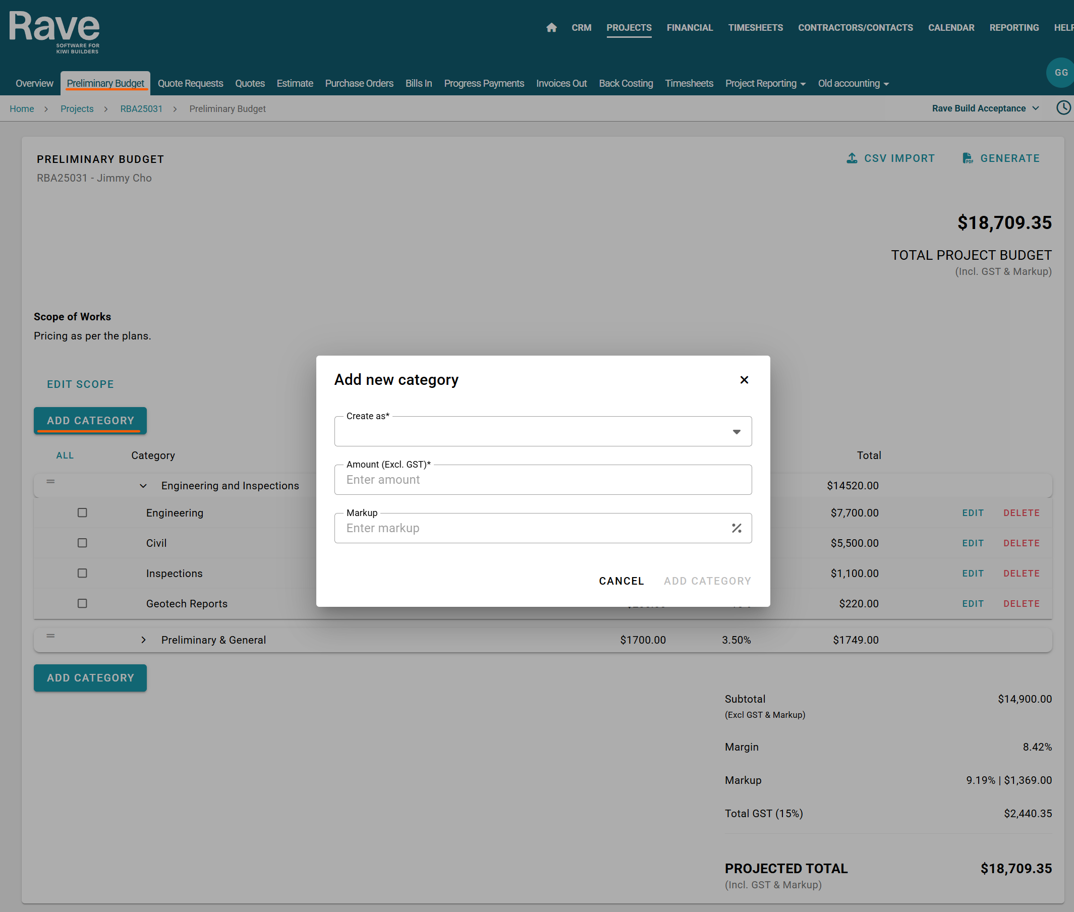 The Preliminary Budget sub-tab is used to create a quick project budget or a client preliminary budget proposal. Within this section, you can easily include a scope of work description and apply a margin or markup to both category and sub category levels.