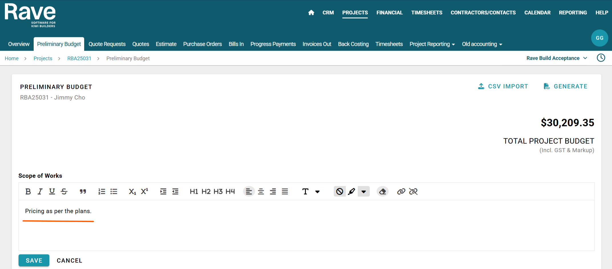 This would be done via the quotes and estimate pages. Preliminary Budget serves as a quick budgeting tool for internal use or to give clients a general cost indication for the project.