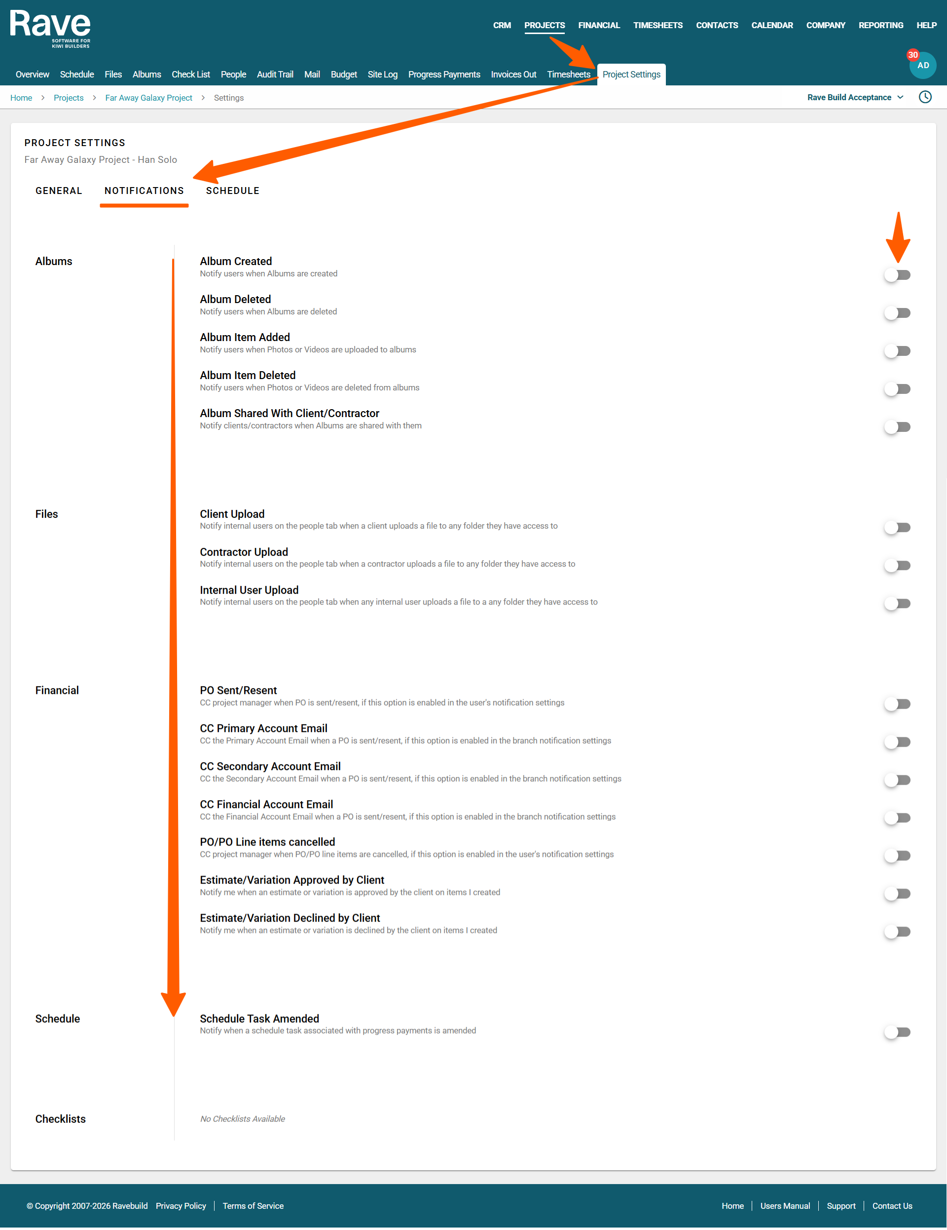 Once inside the Project Settings sub tab you can then turn on/off Project level notifications for Albums, Files, and if you have Financial Management access Purchase Orders and Client Estimate and Variations too.