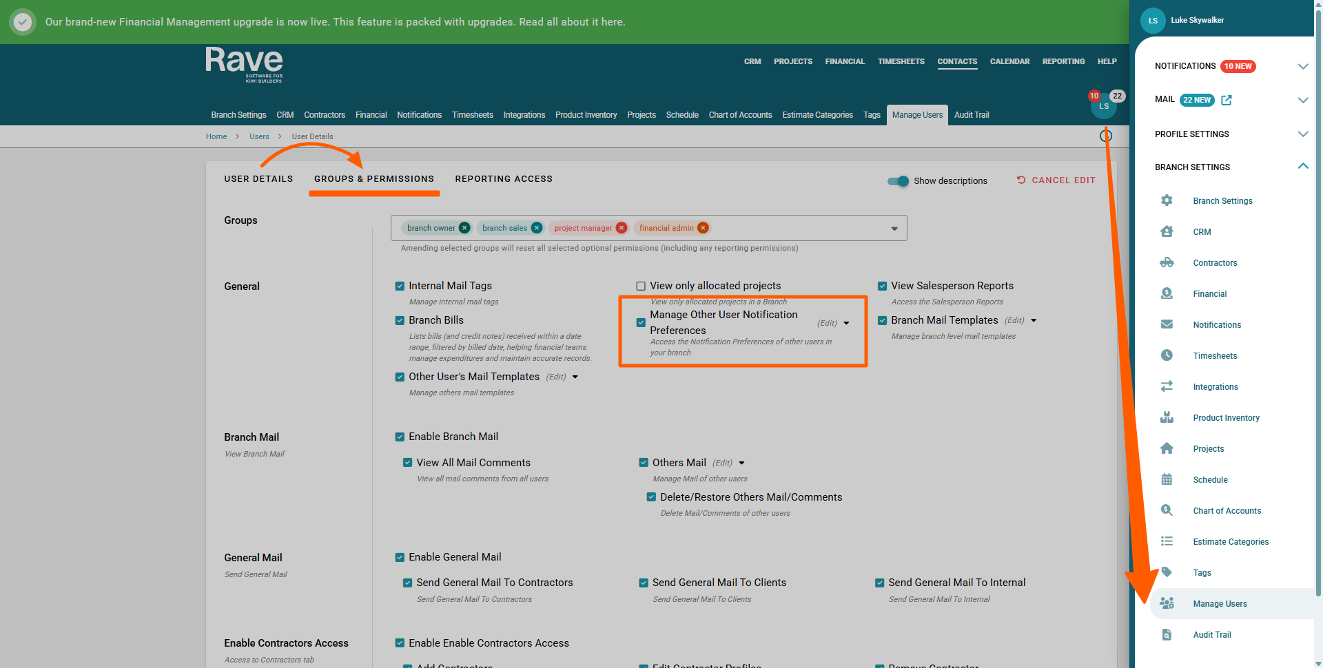 The Manage Other Users Notification Preferences permission, available from the branches' manage users, user details, groups and permissions settings, allows the user to control notifications on behalf of other people.