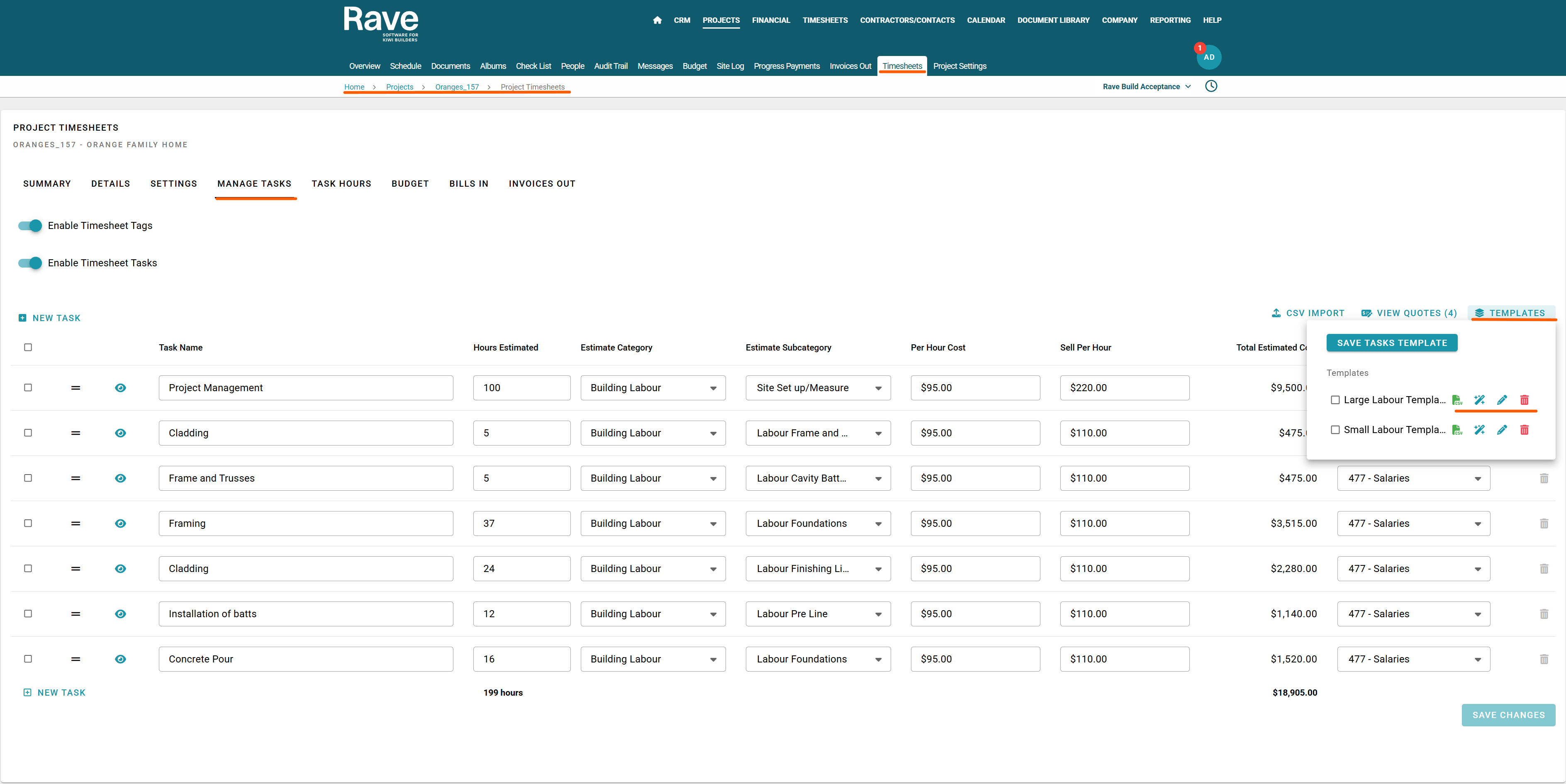 Once you've created your first timesheet tasks budget—either manually or via CSV import—you can save it as a template for future use.