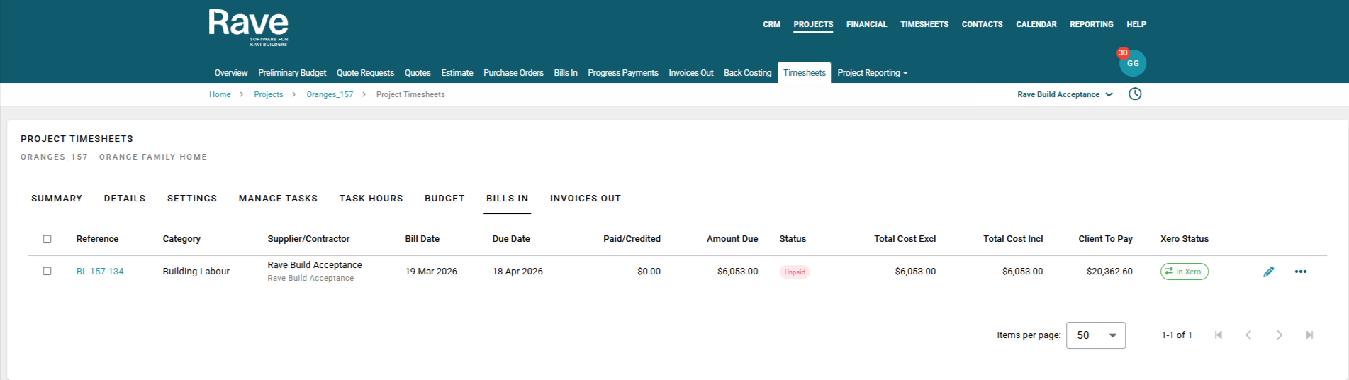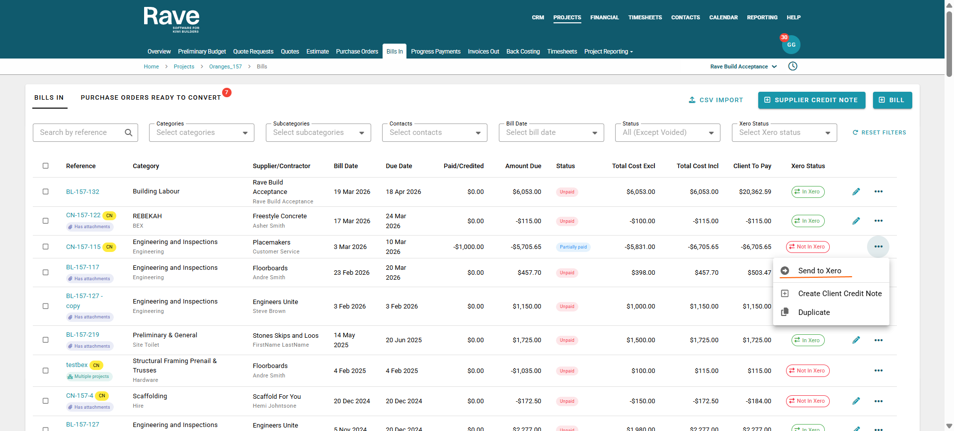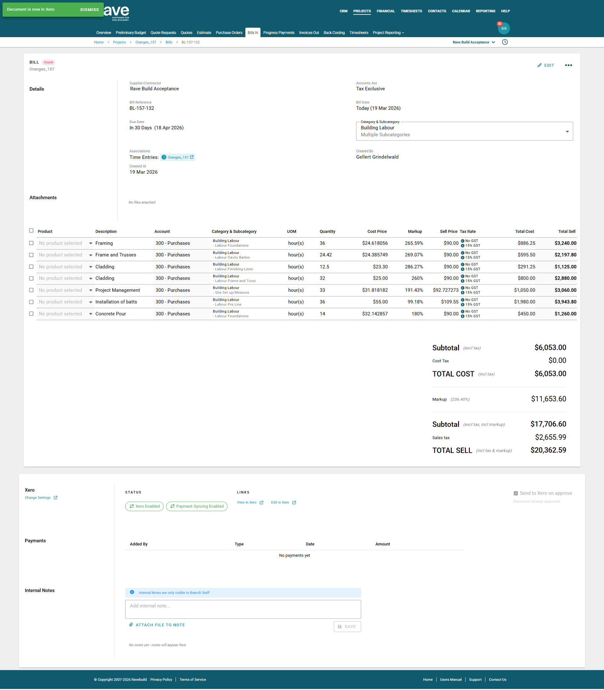 Note: Labour Bills created within the Timesheets feature are not sent to Xero by default. To send a Labour Bill to Xero, you must manually select the "Send to Xero" option. This will send the bill to Xero as a draft Bill.