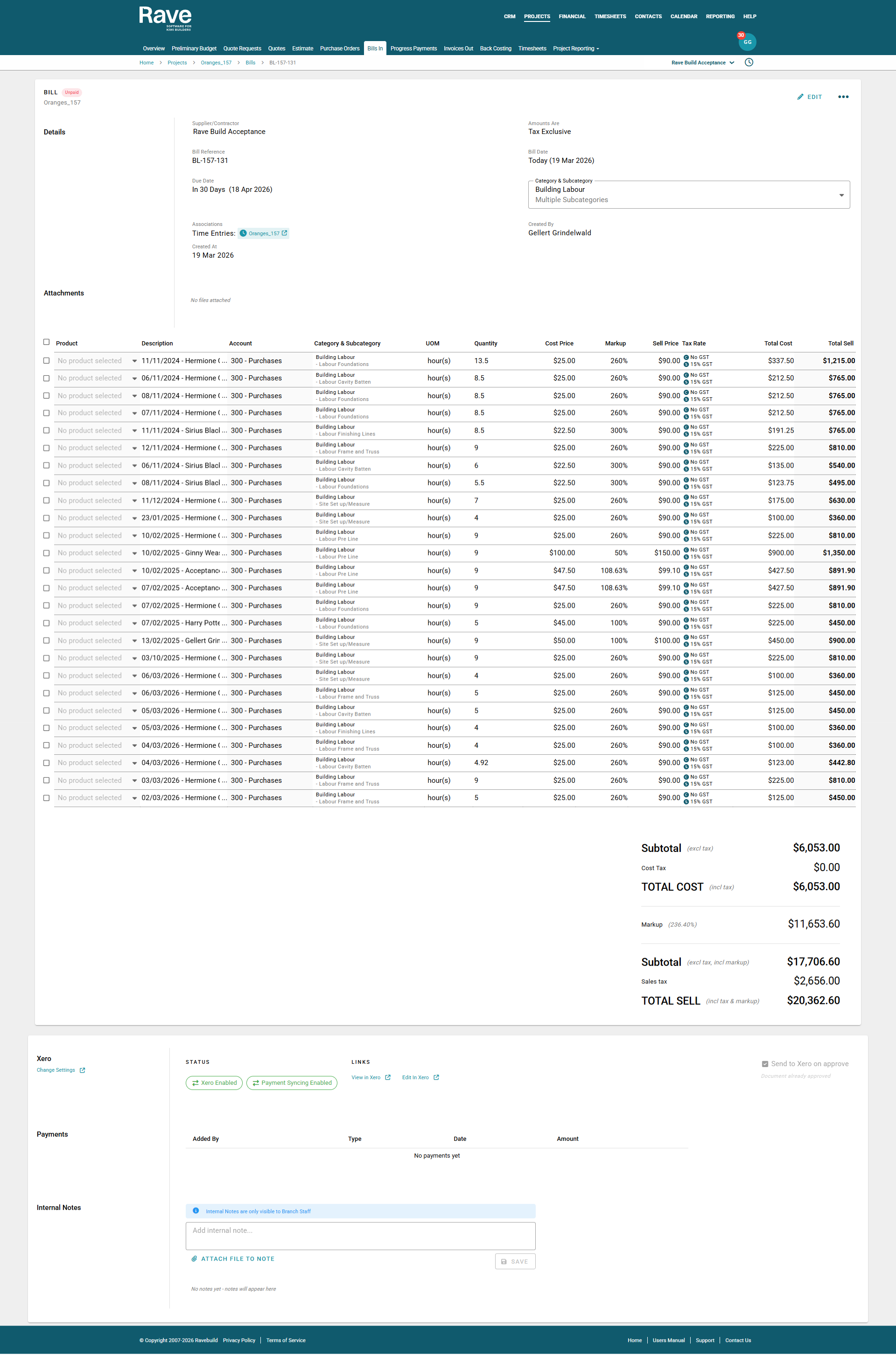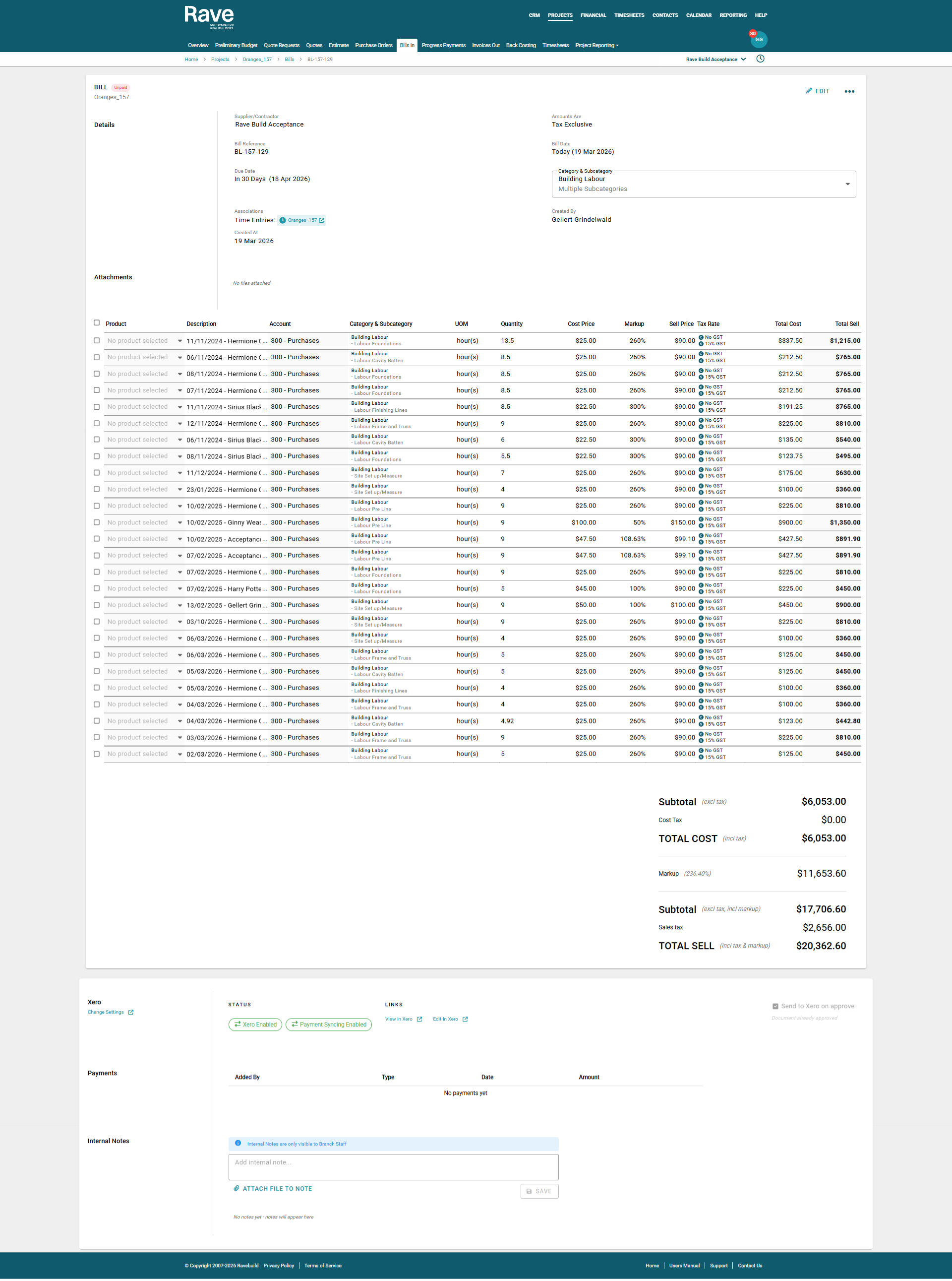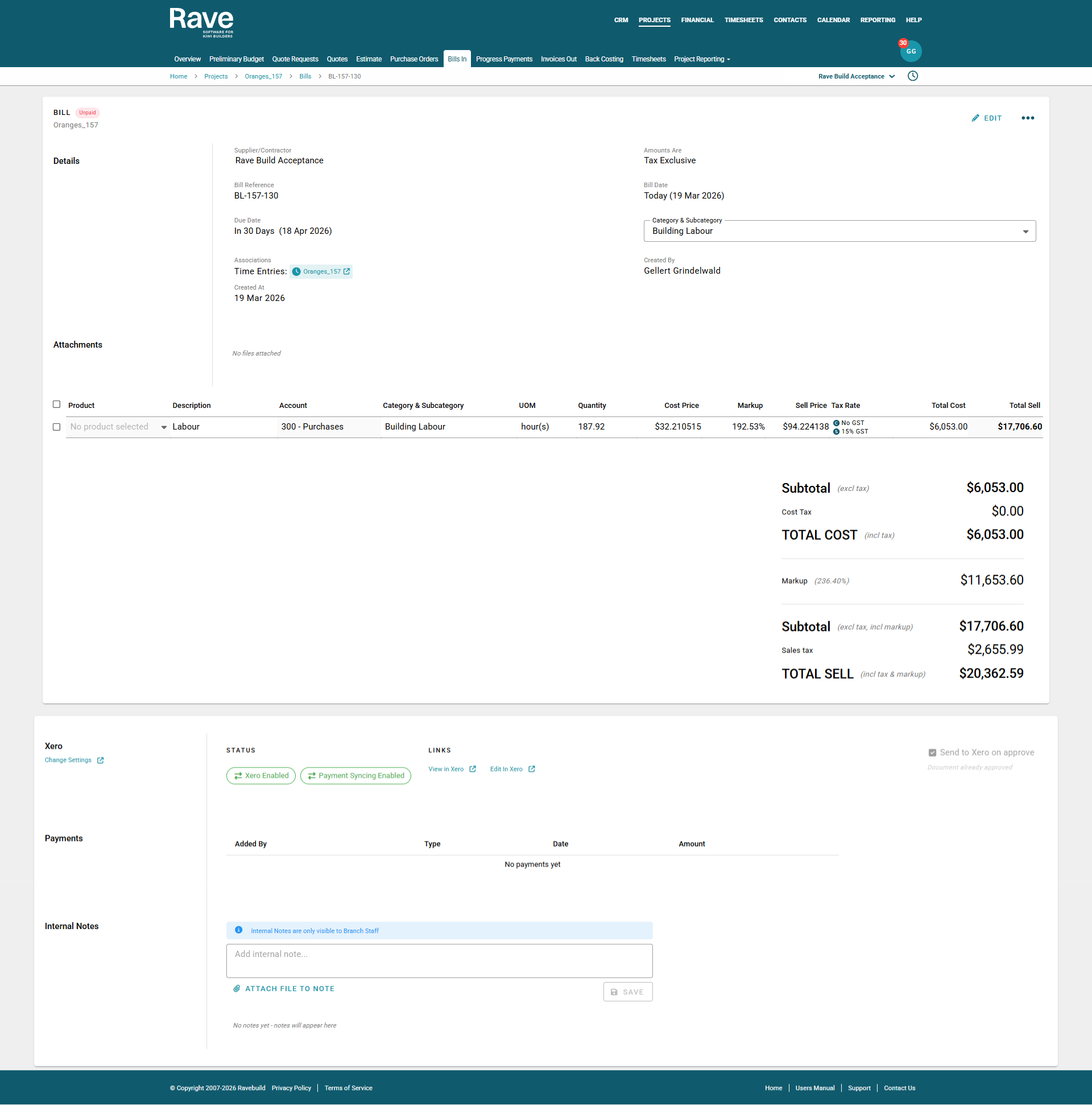 Note: Labour Bills created within the Timesheets feature are not sent to Xero by default. To send a Labour Bill to Xero, you must manually select the "Send to Xero" option. This will send the bill to Xero as a draft Bill.