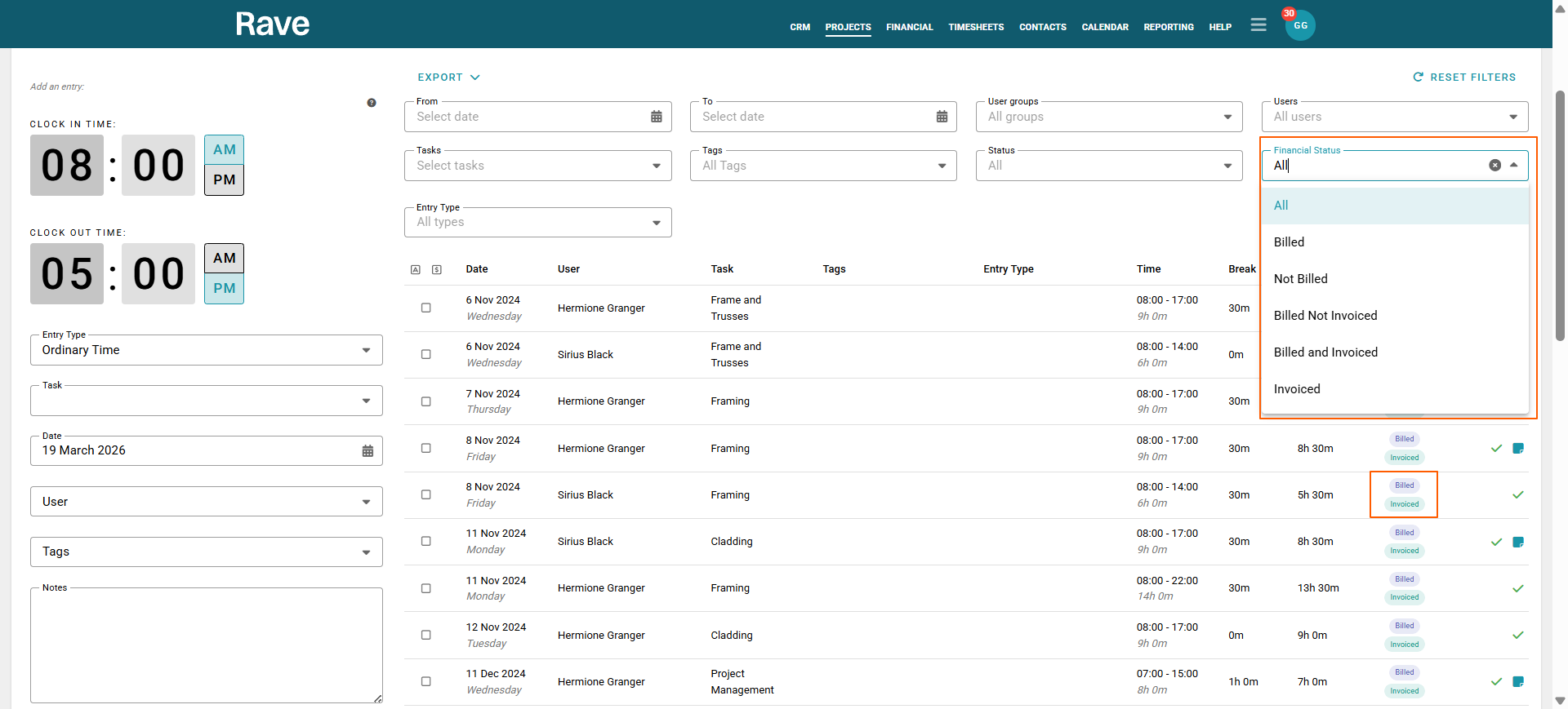 The Financial Status column indicates whether each timesheet entry has been Billed and/or Invoiced. An entry with neither is unbilled and uninvoiced.