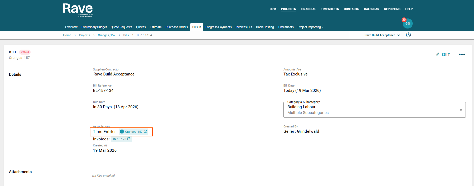 Note: When creating a bill from a timesheet entry, we automatically apply 15% tax to the selling price and No Tax to the cost price in order to ensure you are invoicing your clients GST on their invoice but not entering the cost to the business as GST inclusive, as it's labour.