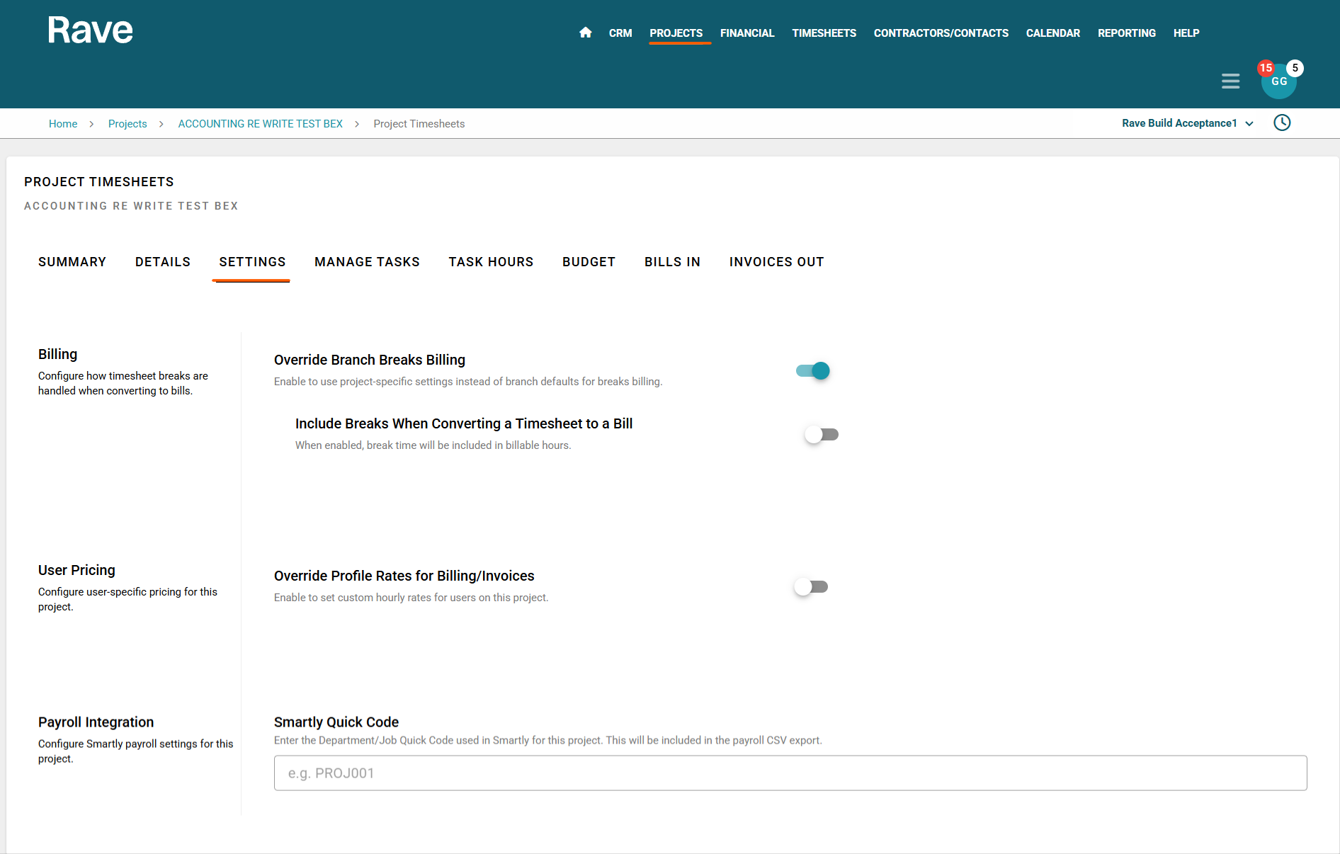 Switch ON → Break time will be included in labour costs when converting timesheets to a bill for this project only.