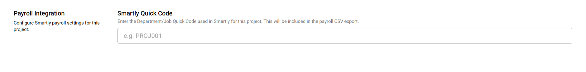 Those clients who have selected Smartly as their Payroll system have the option to connect timesheet entries to Smartly Department/Job Feature. You need to enter your Quick Code for each project in the Smartly Quick Code box on this settings page