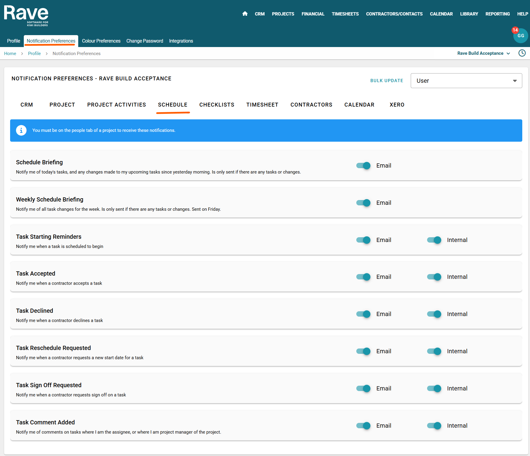 Those with permission to edit other users notifications will see a user box to the top right of their screen where they can pick a user and then select which notifications they would like to alter.