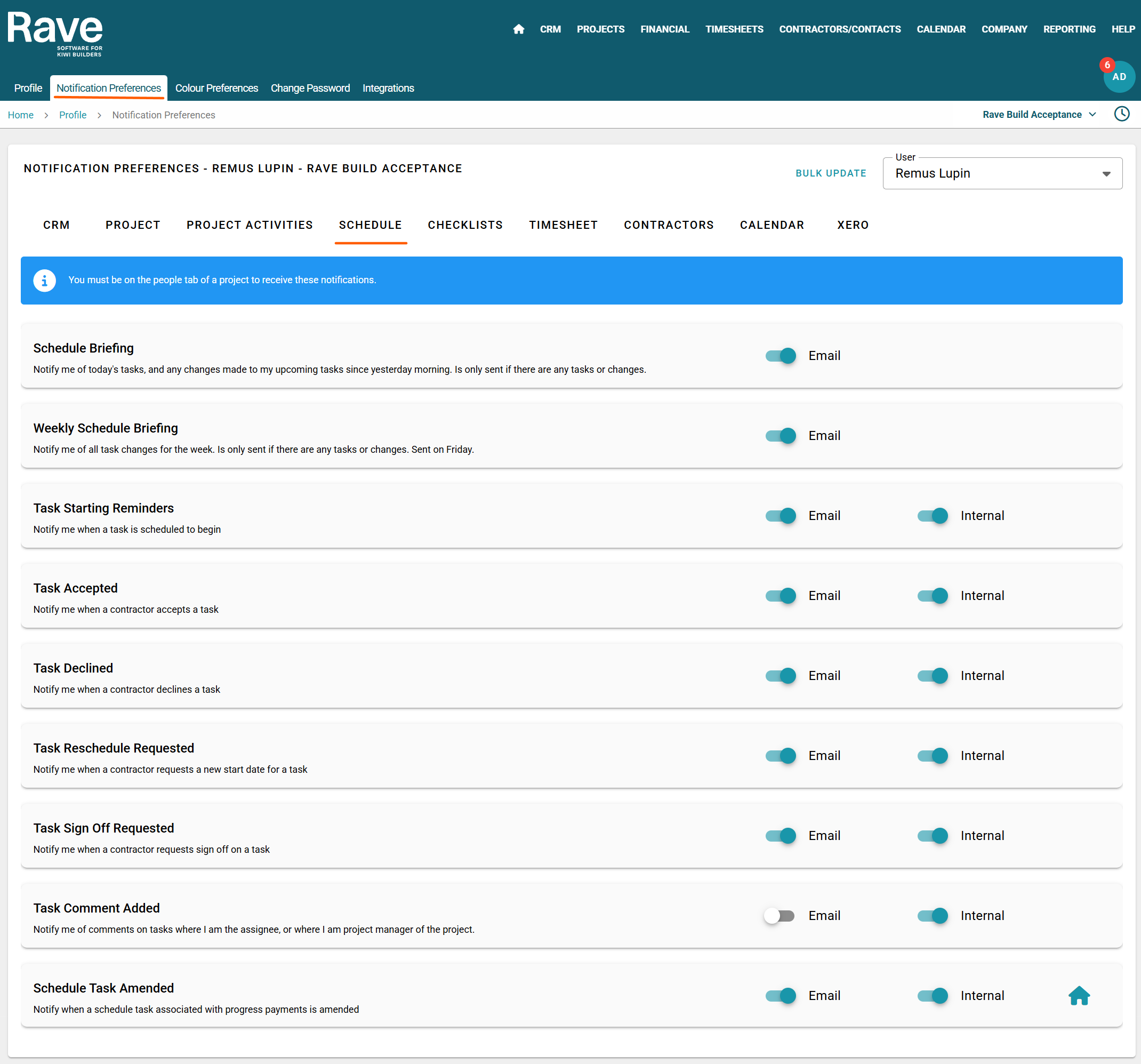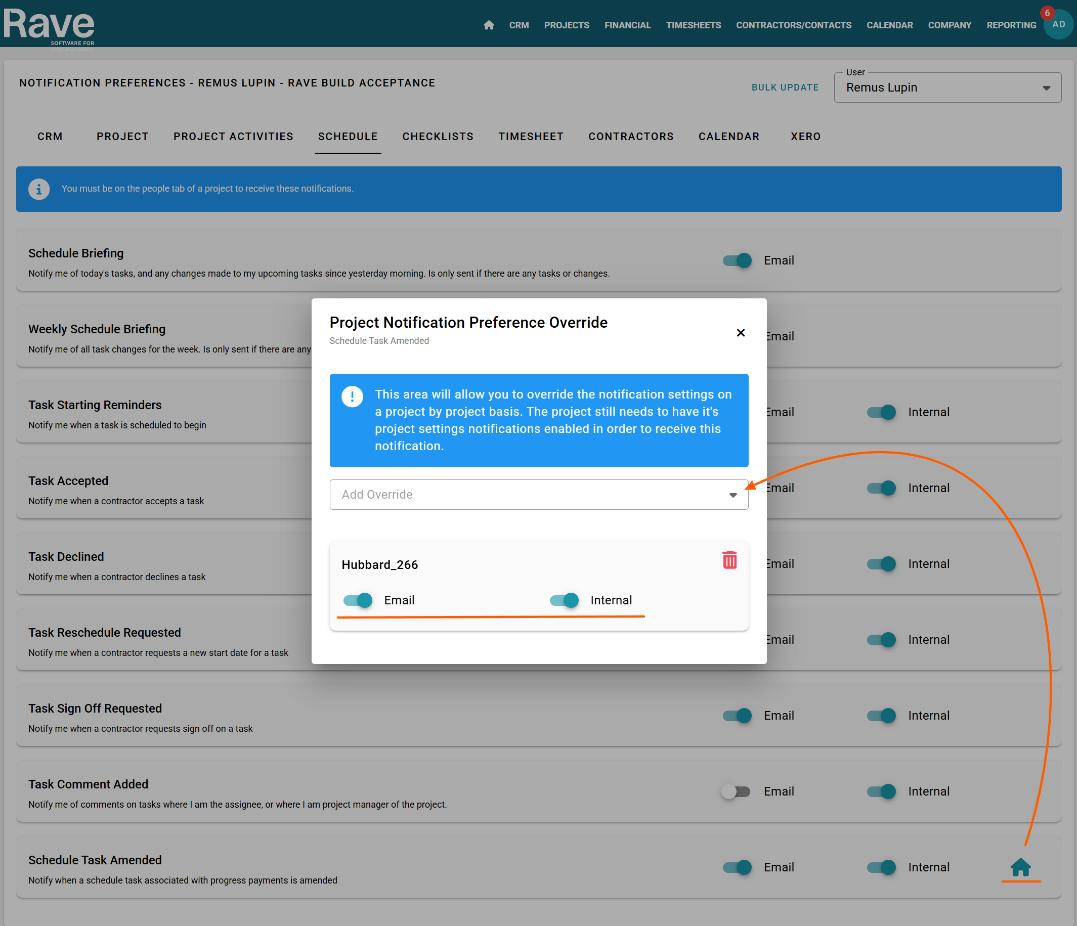 - Schedule Task Amended - There is also a per project override option here. By Clicking on the house icon you can choose which projects you want to be notified about.