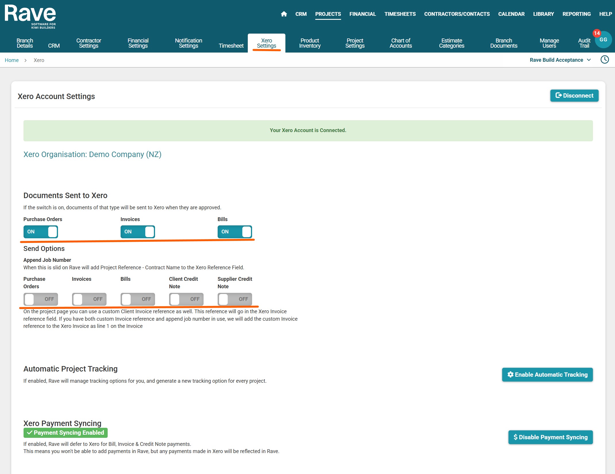 When RAVE Project + Xero Tracking Categories is enabled, RAVE will automatically track your invoices and bills in both RAVE and Xero using your RAVE project’s Job Number.