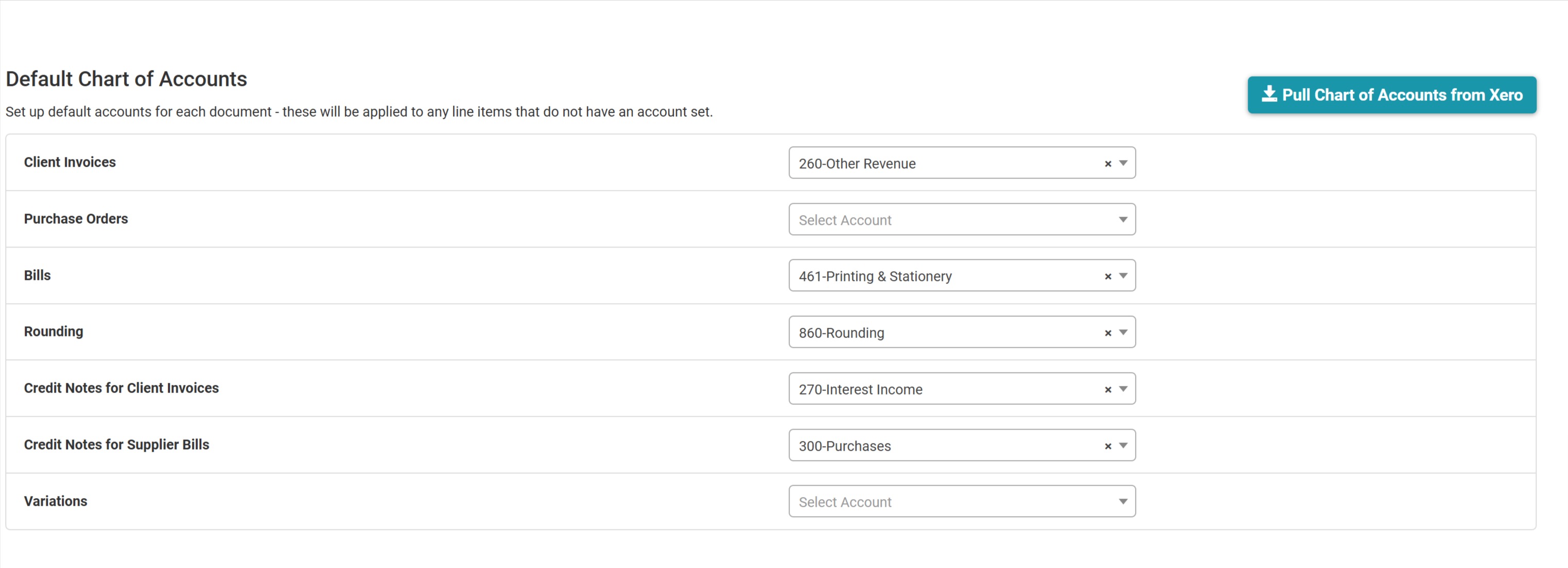 After importing your Chart of Accounts from Xero, the next step is to set up your Default Chart of Accounts in RAVE. These defaults will be applied to any payments, purchase orders, bills, and credit notes—both for client invoices and supplier bills—that do not already have a Chart of Account manually selected.