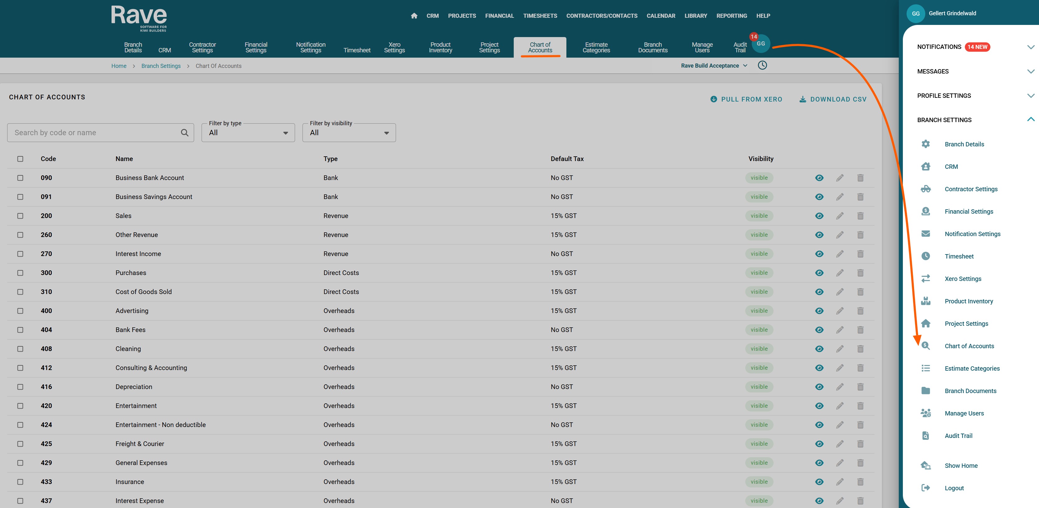 Click on your Profile Dropdown in RAVE to access additional menu options.Select Branch Settings