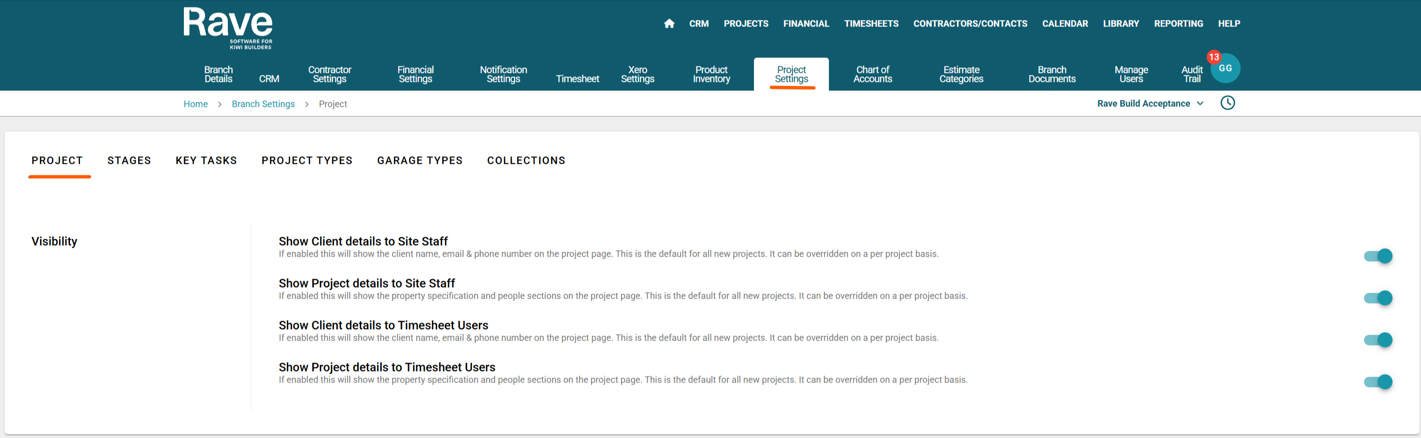 Branch owners have the permissions-based ability to customise various parts of their Projects pages. If your Rave account is part of a Franchise Business that has a head office/support office that controls these settings, the tabs will not be available for you to view/edit. If you are at a head office level, you will see the orange warning box below indicating that you are changing settings for ALL your franchises.