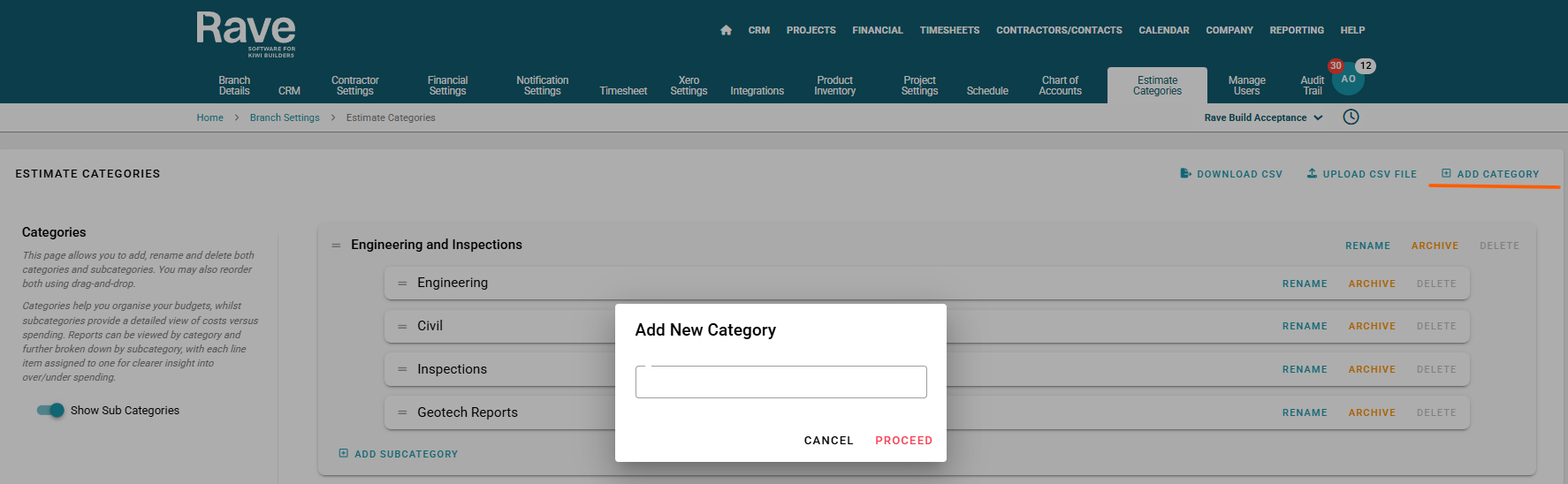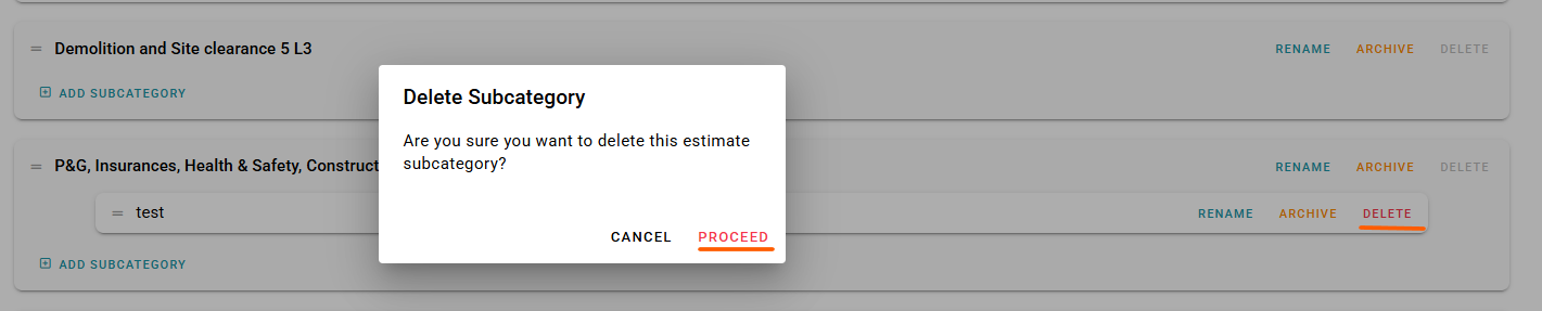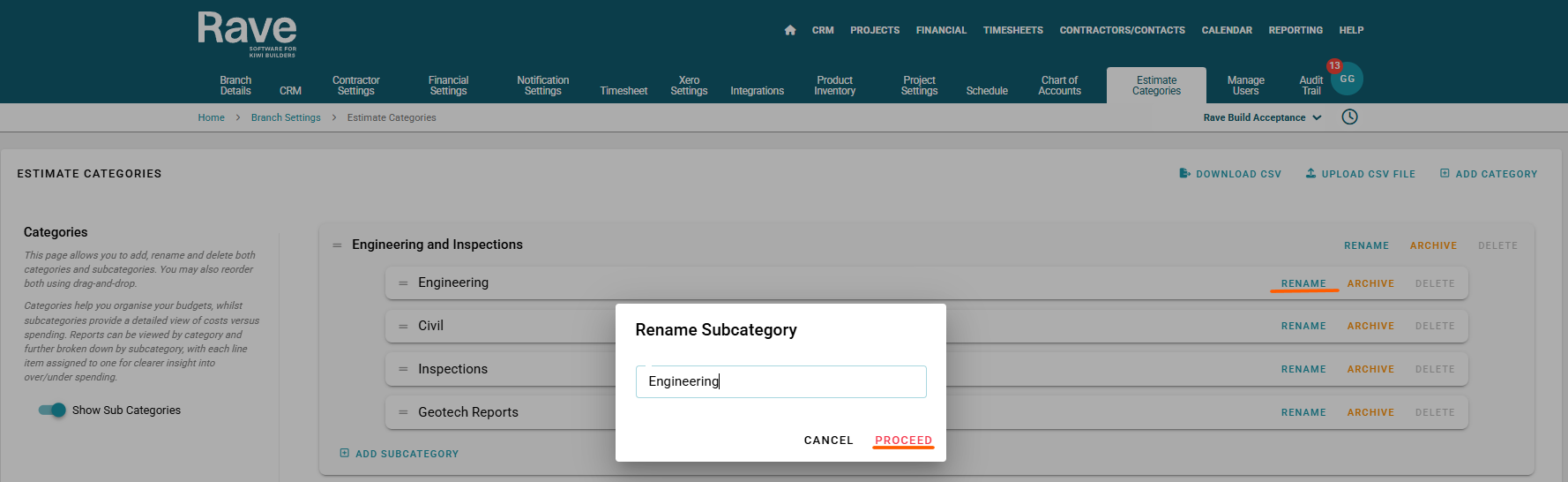 To edit a category or subcategory, click the Rename button. This will allow you to update the name of the category or subcategory. Once you’re finished, click Proceed to save your changes.