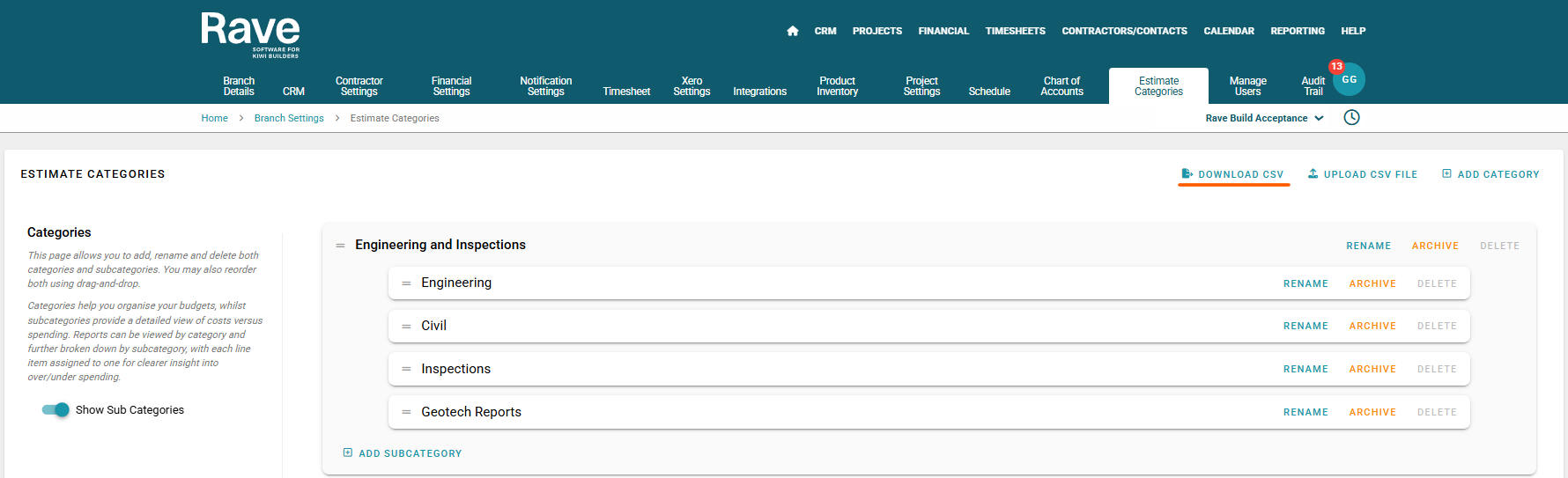 Users have the ability to upload or download their Category and Sub-categories via CSV.