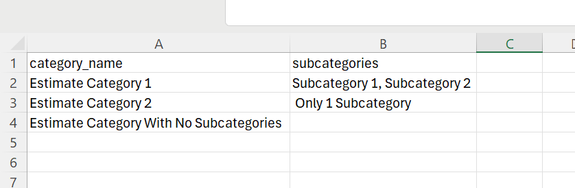 If a Category has multiple Sub-Categories, enter them on the same row in Column B, separated by commas.