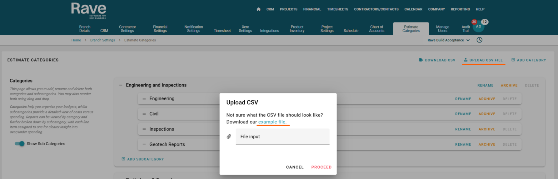 When uploading your Estimate Categories into Rave you must use the example file to get the correct format. The sample file is found by selecting the upload csv file button: