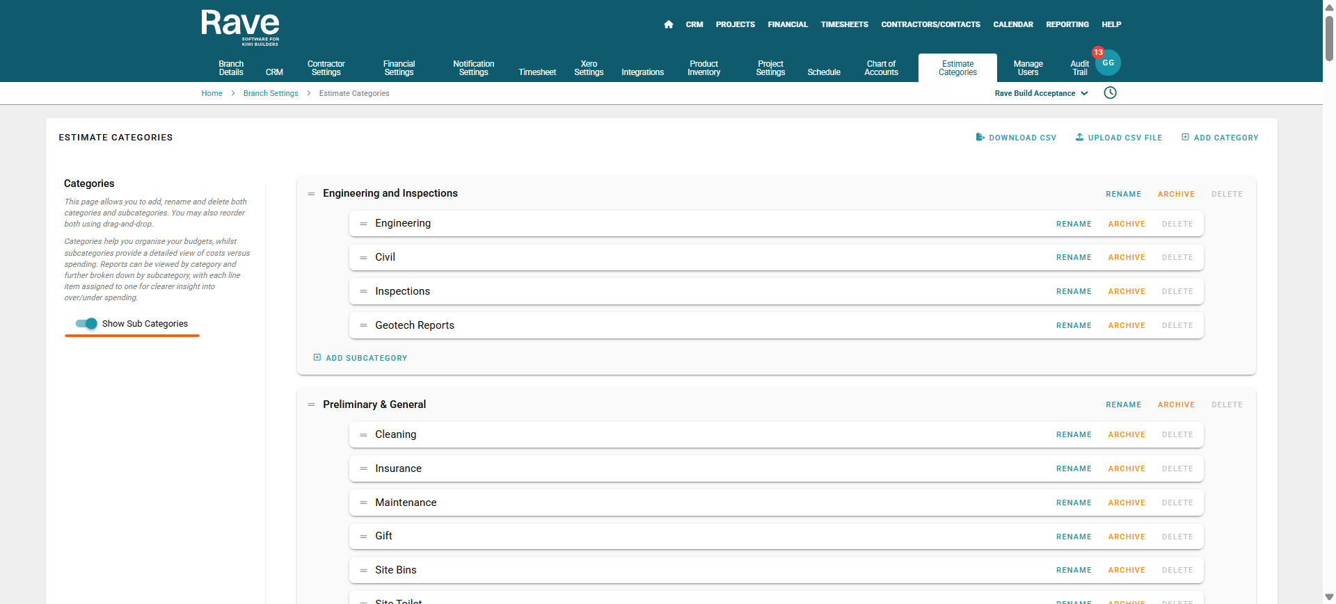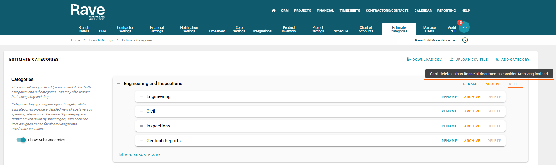 If you no longer want to use an estimate category, you can delete it by selecting the red Delete button. If the delete button is grey out it means you cannot delete the category as it has financial records against it. You can choose to archive (see above) or reassign a category or sub category to something else then delete it once its not in use. You need to reassign at the document level to free up to then be able to delete it. The best report to view where categories and subcategories are used across the entire business is the Branch Transaction Report. See the article here.