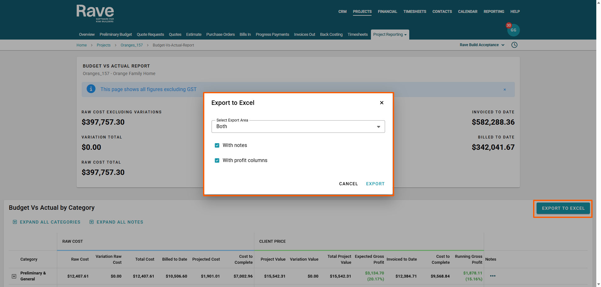 RAVE FMS's 'Budget Vs Actual' report allows you to easily view ALL of your project's Key approved cost and sell data fields all in one place across Categories and Sub-Categories. We break the information down into "Raw Cost" and "Client Price". The export function allows you to choose which side of the information you want to export or ALL of it into one report.