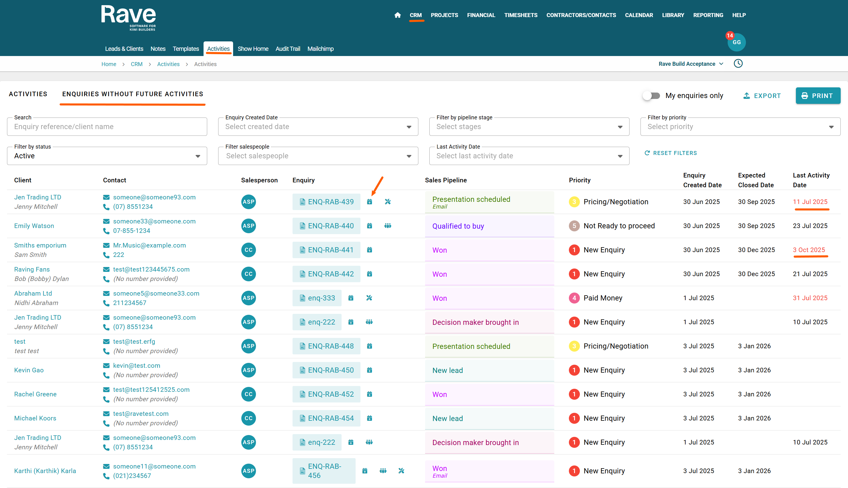 Rave's CRM Activities page is here to help you ensure you are always on top of client communication - You wont miss a single sale for the simple mistake of forgetting to make a follow up to your clients. With that in mind, we have two Activity sub-tabs - the Activities report, and the Enquiries without Future Activities report.