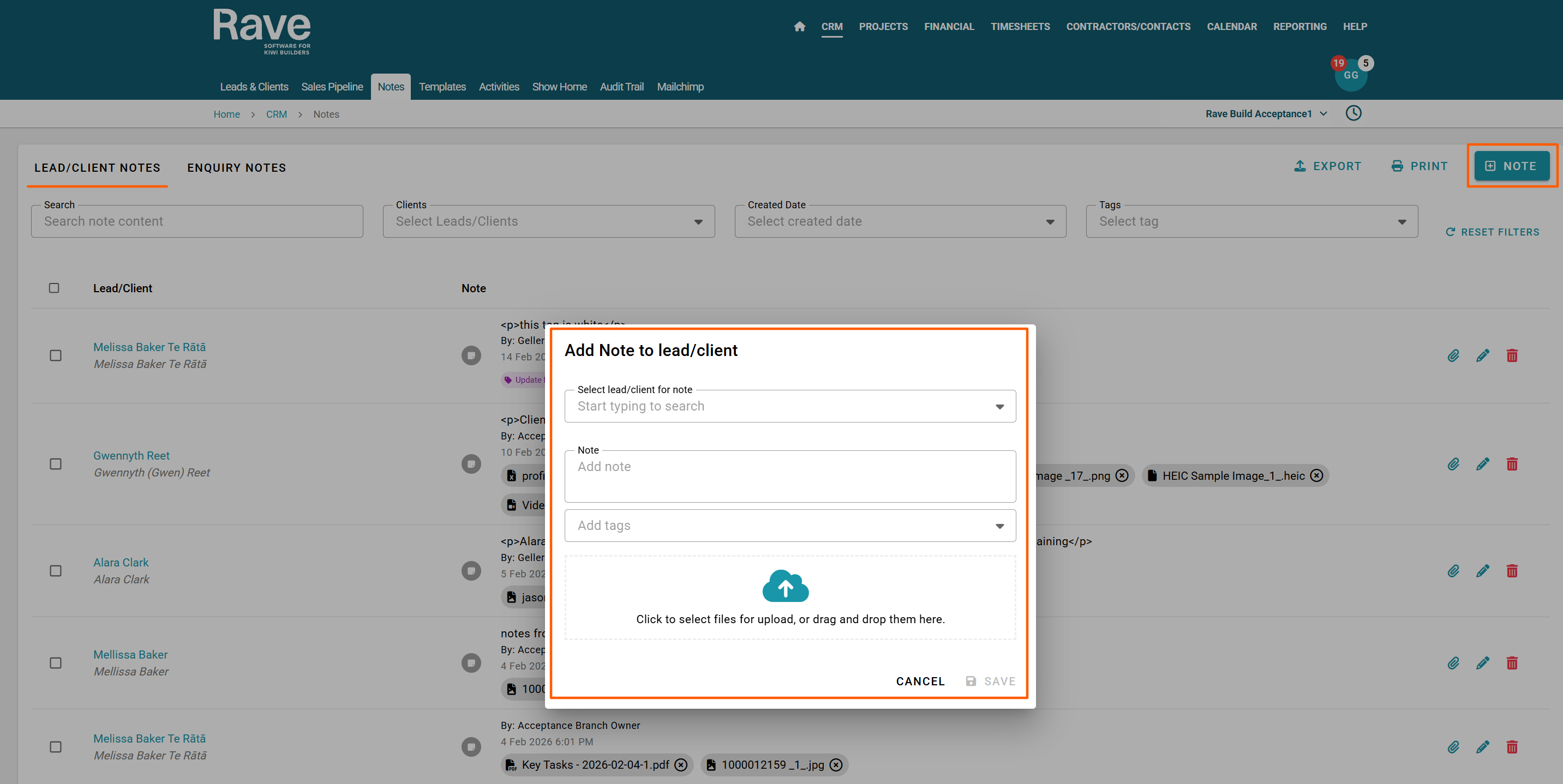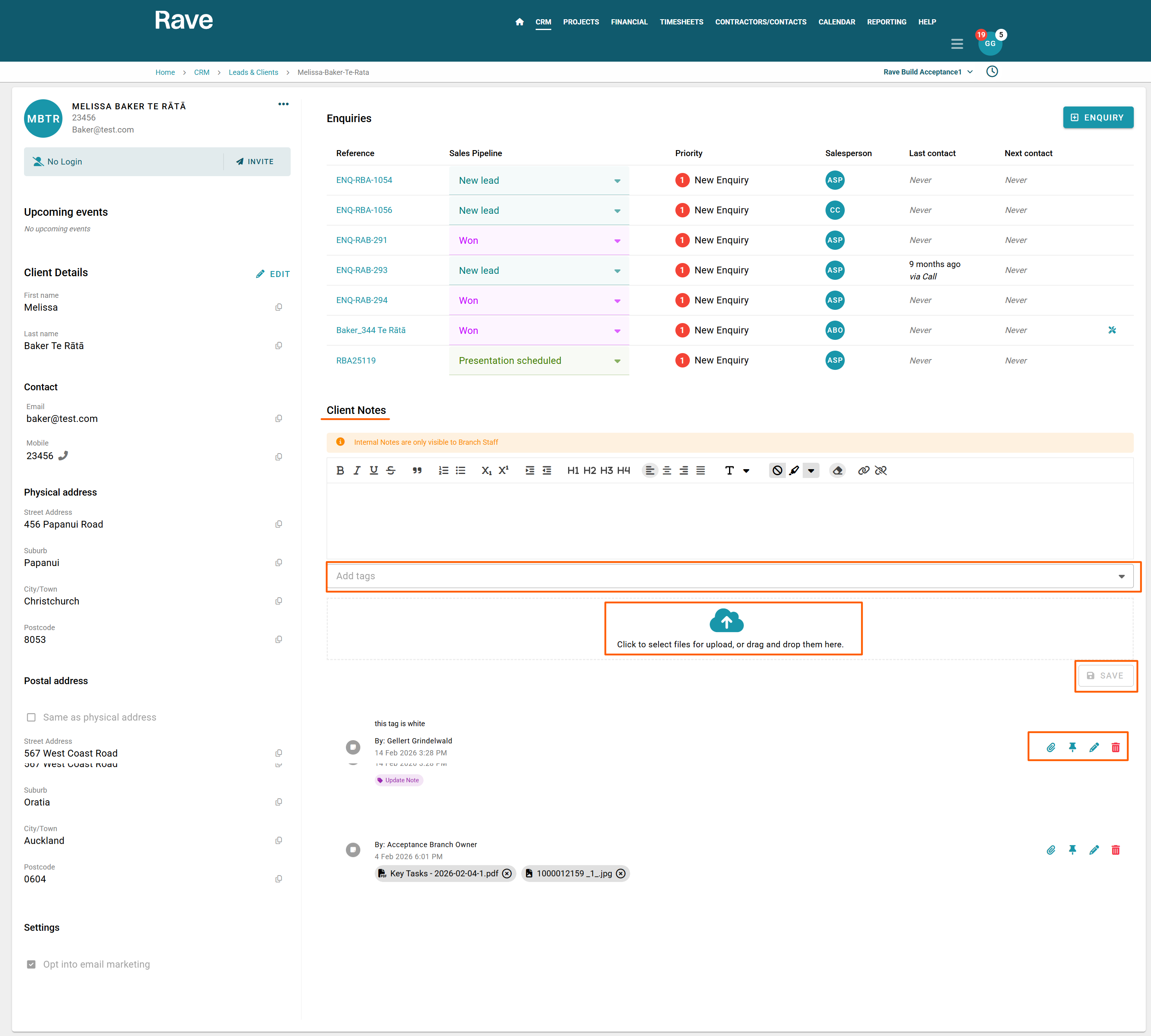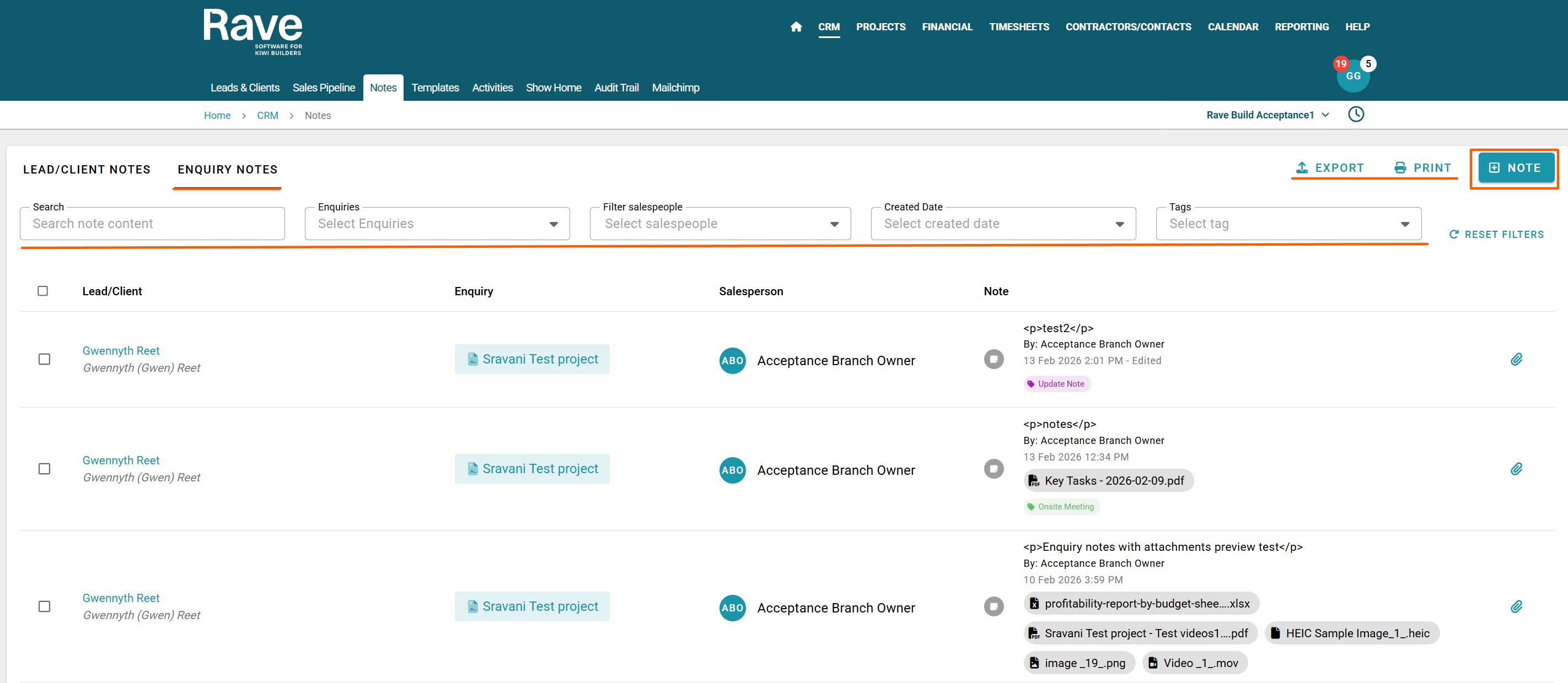 Rave's CRM Notes tab is where we group and display all Branch Client and Enquiry notes for your entire business. It is also a great way to view, add, export or print all notes with filters for certain keywords, client names, enquiry references or dates.