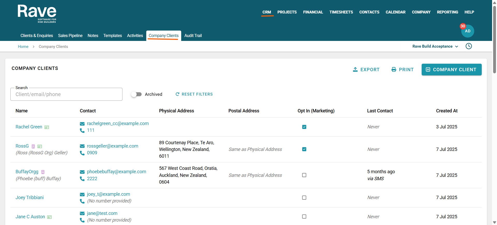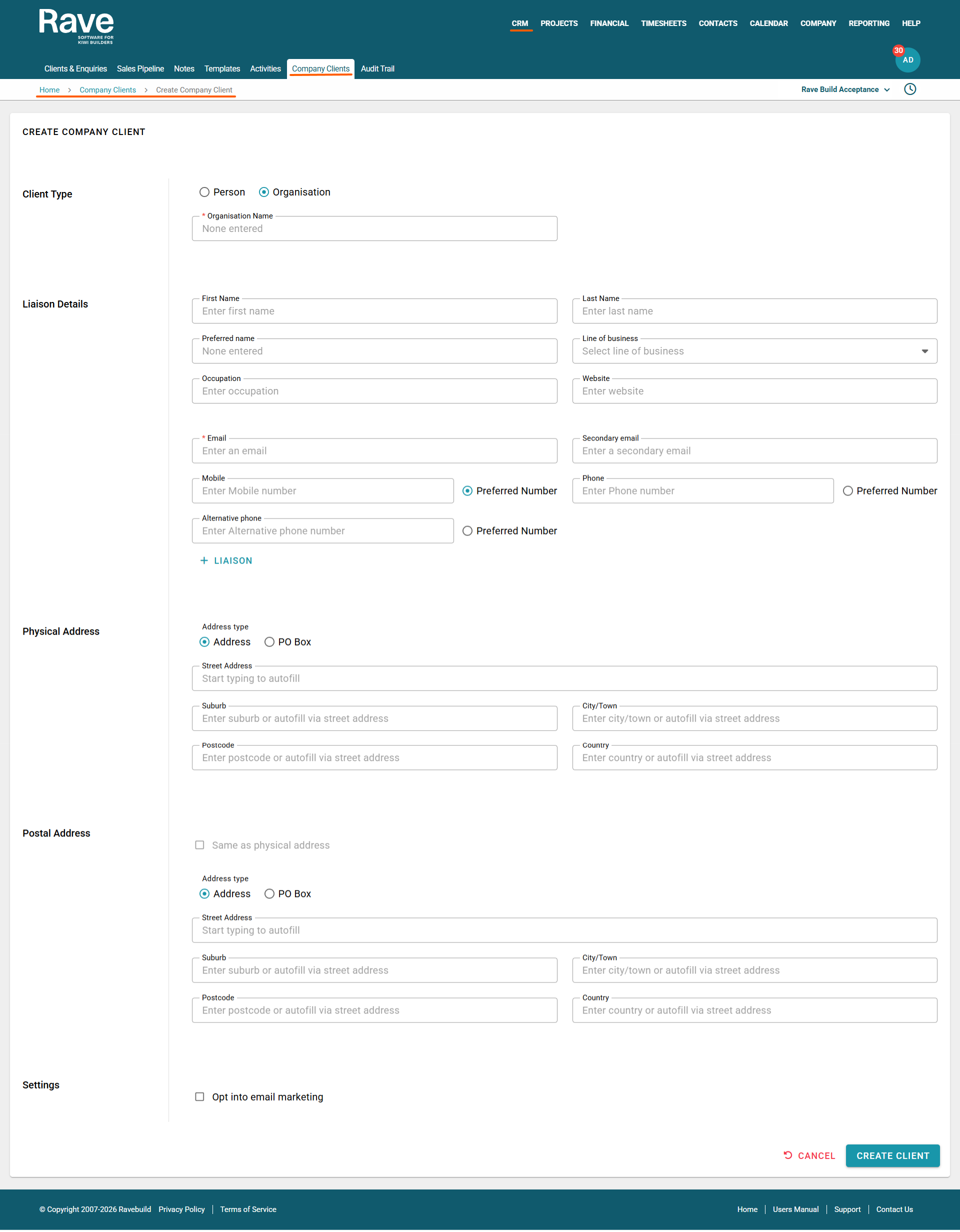 Clicking on the '+ Company Client' button opens the Create Company Client screen. From here, click the client type of person or organisation, and essentially, you're just filling in as many fields as you can. You need to complete all of the mandatory fields i.e. contact first and last name for an individual, or an organisation name for an entity. If you don't have all the information to hand, no worries, complete the details that you do have, as you can always return later to edit your client's profile. Press the Create Client button once you're done to complete.