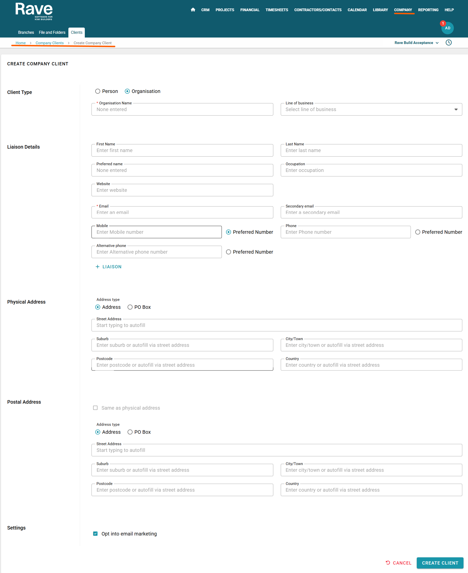 Clicking on the '+ Company Client' button opens the Create Company Client screen. From here, click the client type of person or organisation, and essentially, you're just filling in as many fields as you can. You need to complete all of the mandatory fields i.e. contact first and last name for an individual, or an organisation name for an entity. If you don't have all the information to hand, no worries, complete the details that you do have, as you can always return later to edit your client's profile. Press the Create Client button once you're done to complete.