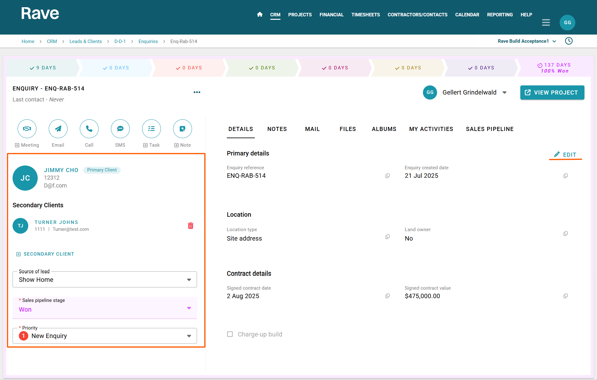 At the top of the Enquiry Screen is Raves Sales Progression Pipeline