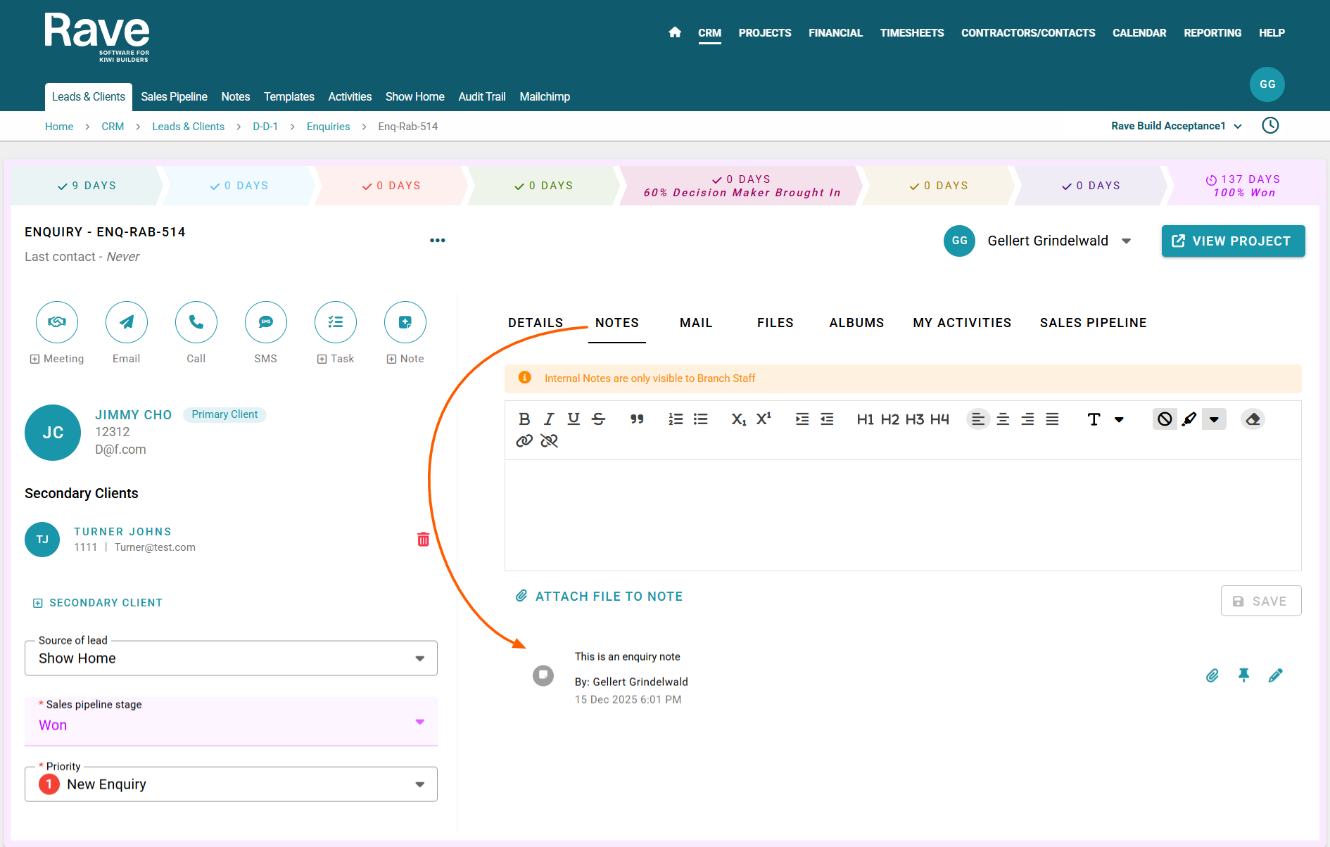 To learn more about Enquiry Notes please see the detailed help article CRM - Enquiry Notes. To learn more about Enquiry notes at a Branch level click the article link here CRM - Branch Lead/Client and Enquiry Notes.