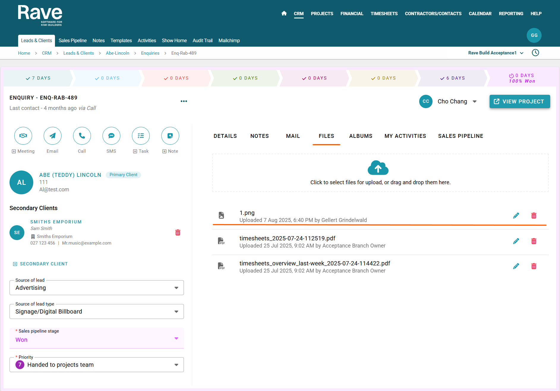 Your Enquiry Tab is set up to view, store and upload important information relevant to your Enquiry (or sales lead) in Rave.