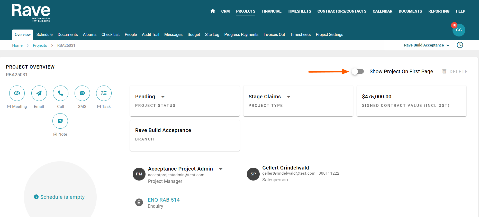 - At the top of the Project's screen you will see the toggle 'Show Project on First Page'