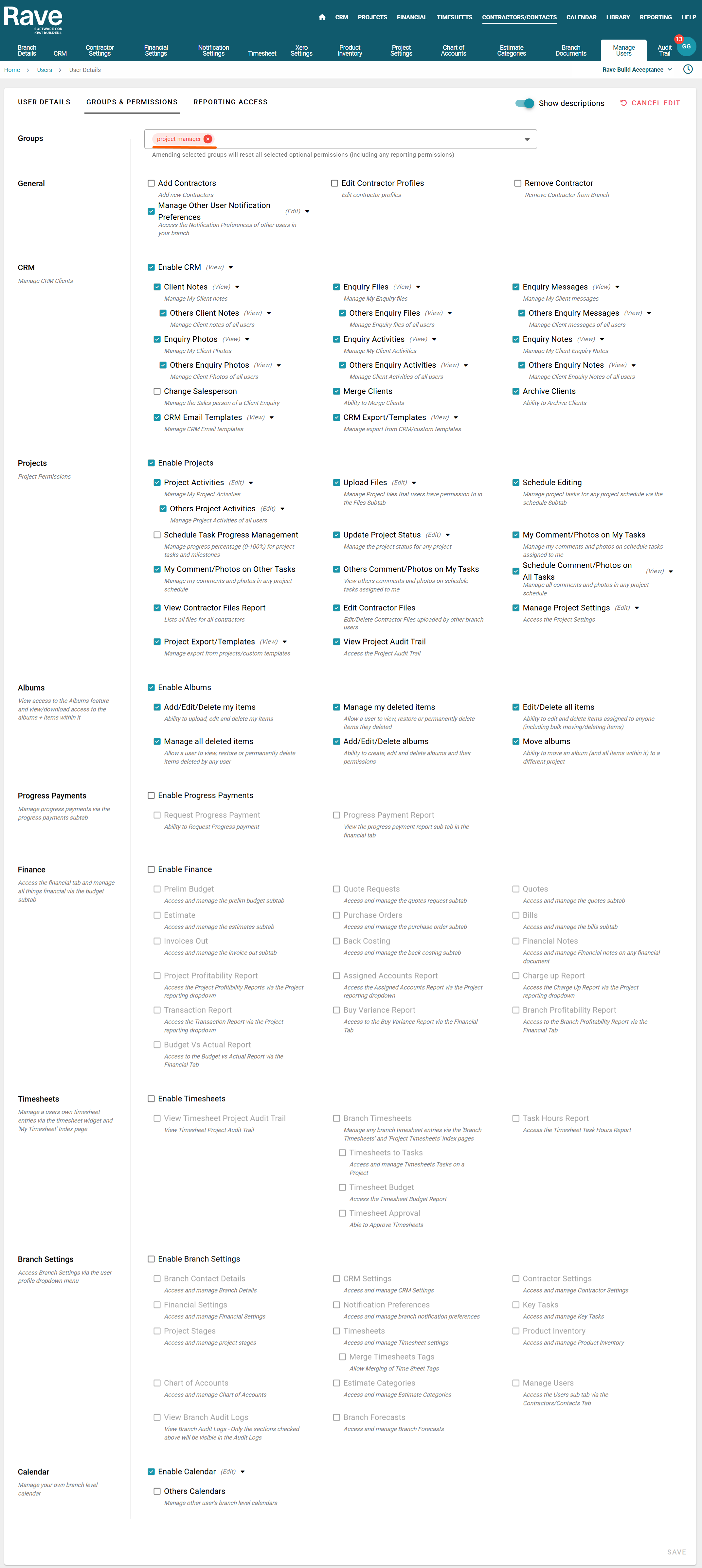 Project Manager is designed for team members who manage both project and client data at a high level mostly in the Project Parts of Rave.