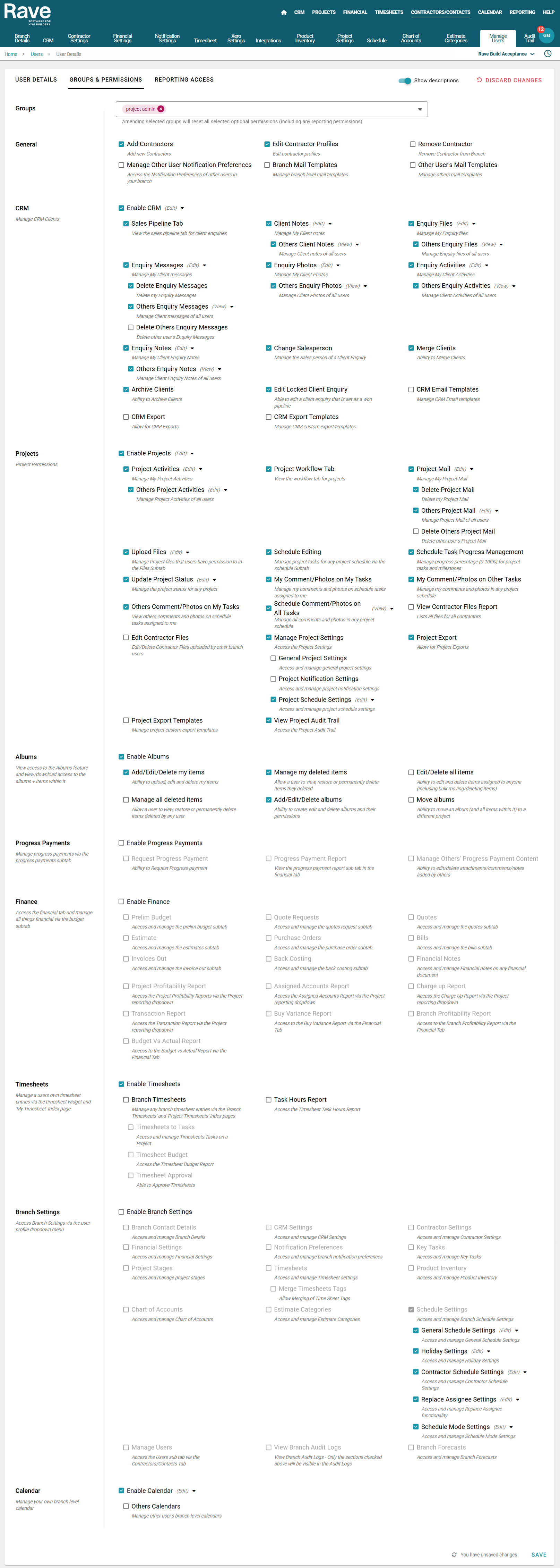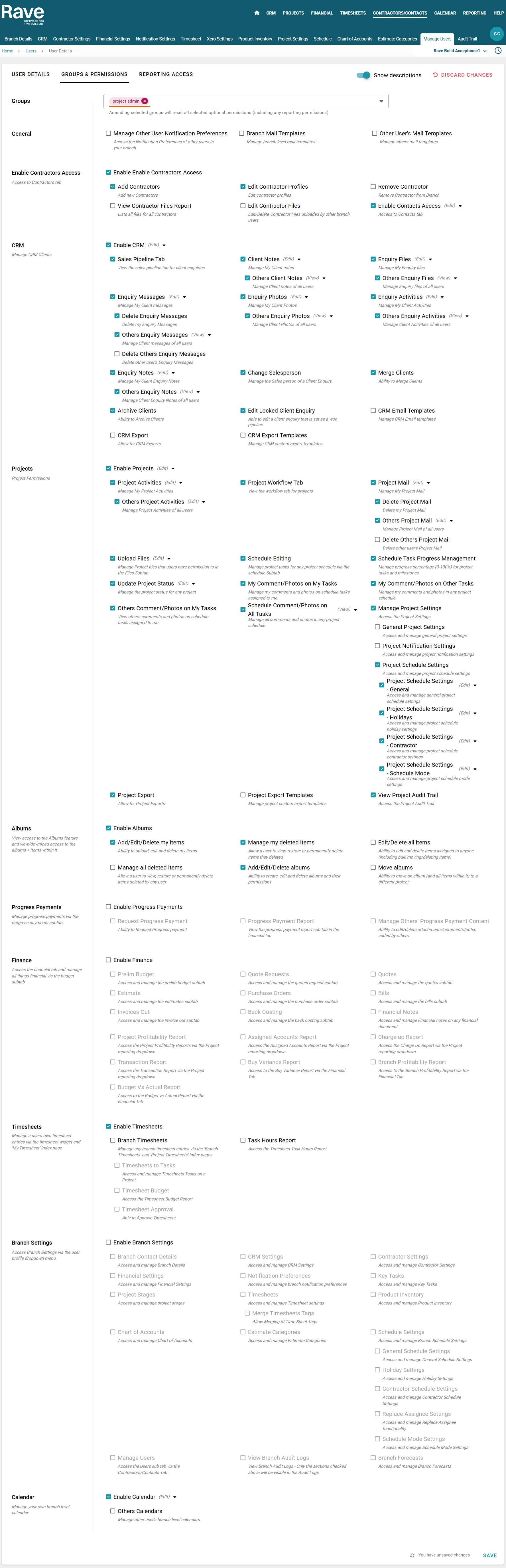 Project Admin is designed for team members who manage both project and client data at a high level between the CRM and PROJECT parts of Rave and options within the Financial Parts of Rave.