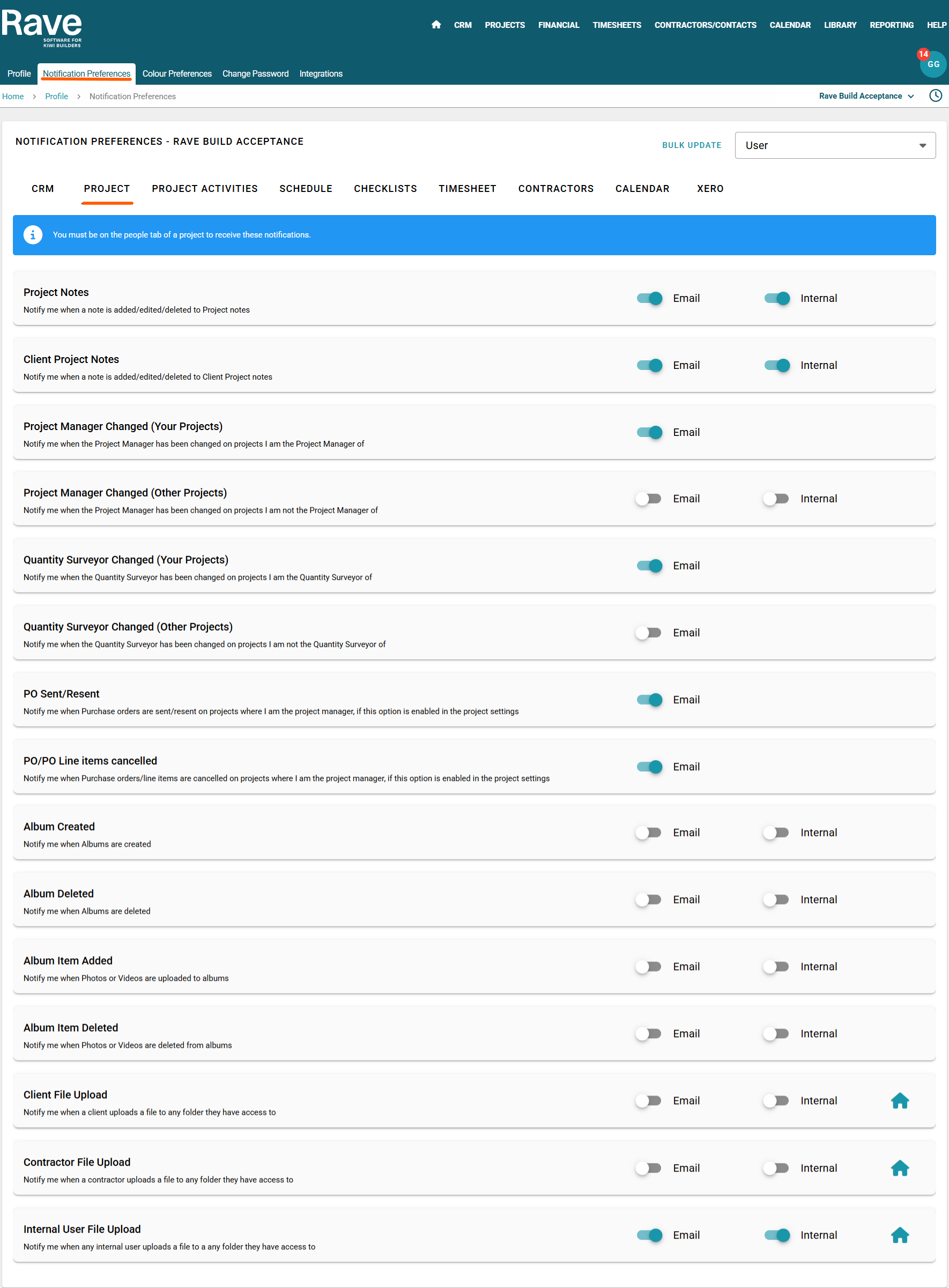 - Quantity Surveyor Changed (Others Projects) i.e. notify me when the Quantity Surveyor has been changed on projects I am not the Quantity Surveyor of