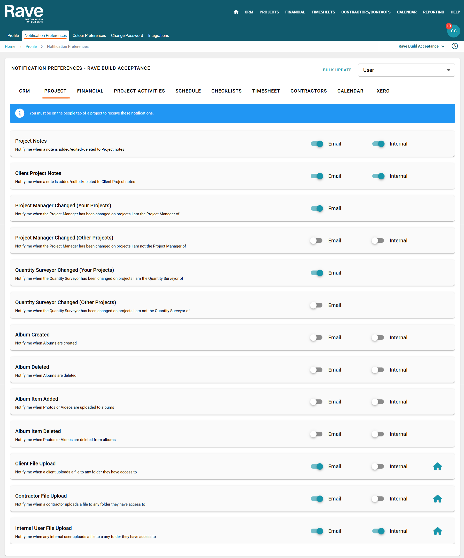 Example: If a certain user has access to 10 projects in Rave and all of those projects have their Project Level notifications turned on and the user themselves has their User Notifications turned on they can choose to opt out of any projects they DONT want notifications for.