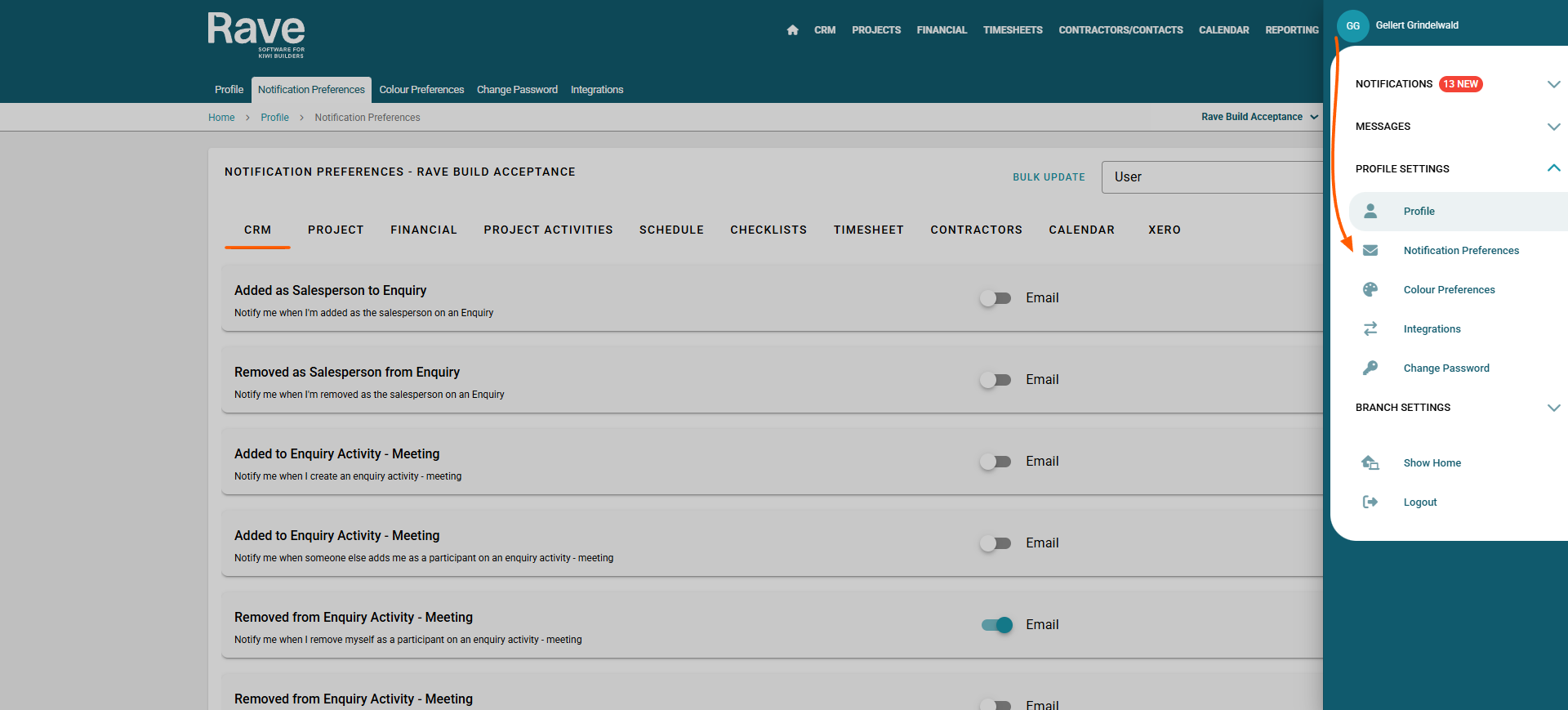 Those with permission to edit others Notifications will see a User Drop down box to switch between the different team/staff members to alter their notification preferences.