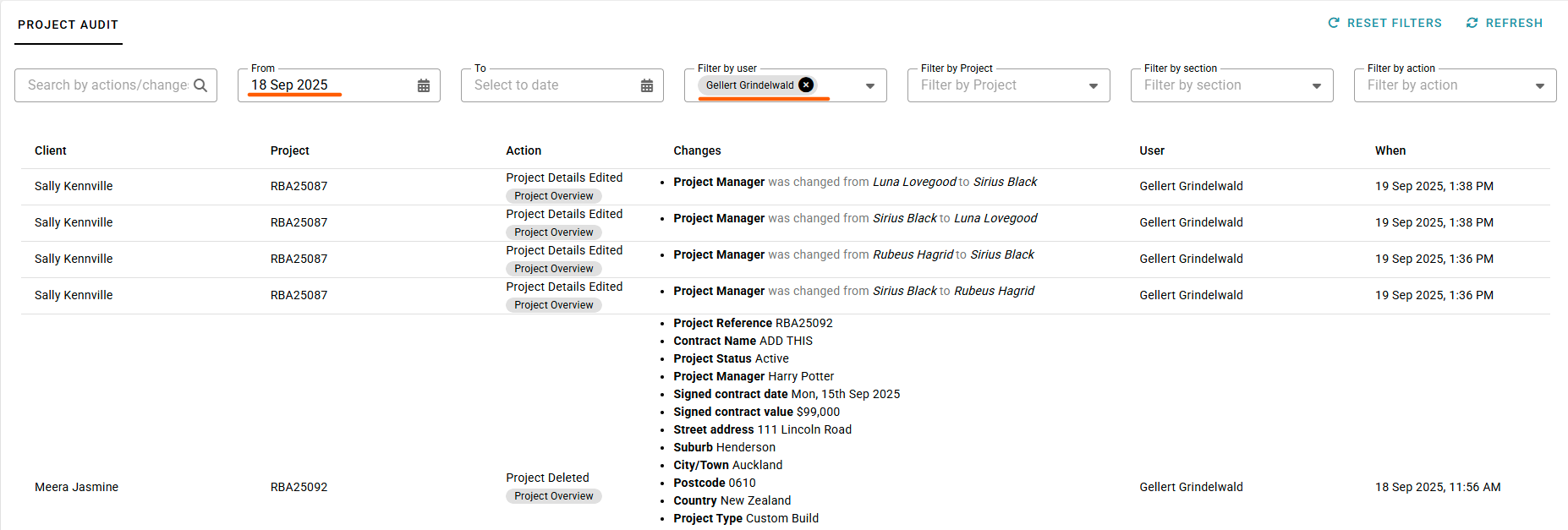 Filter by action – e.g. deleting a project, editing details, adding notes, and more